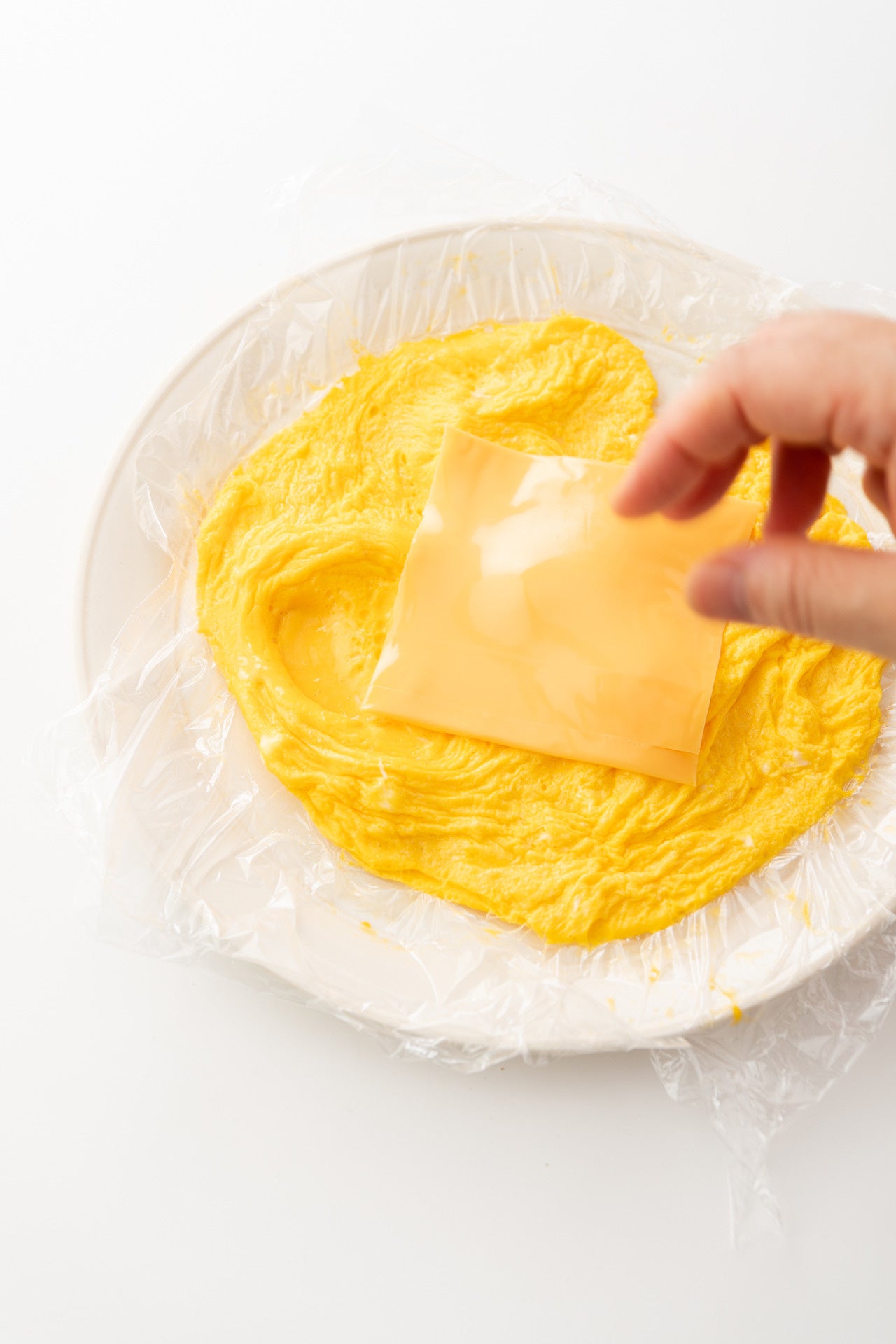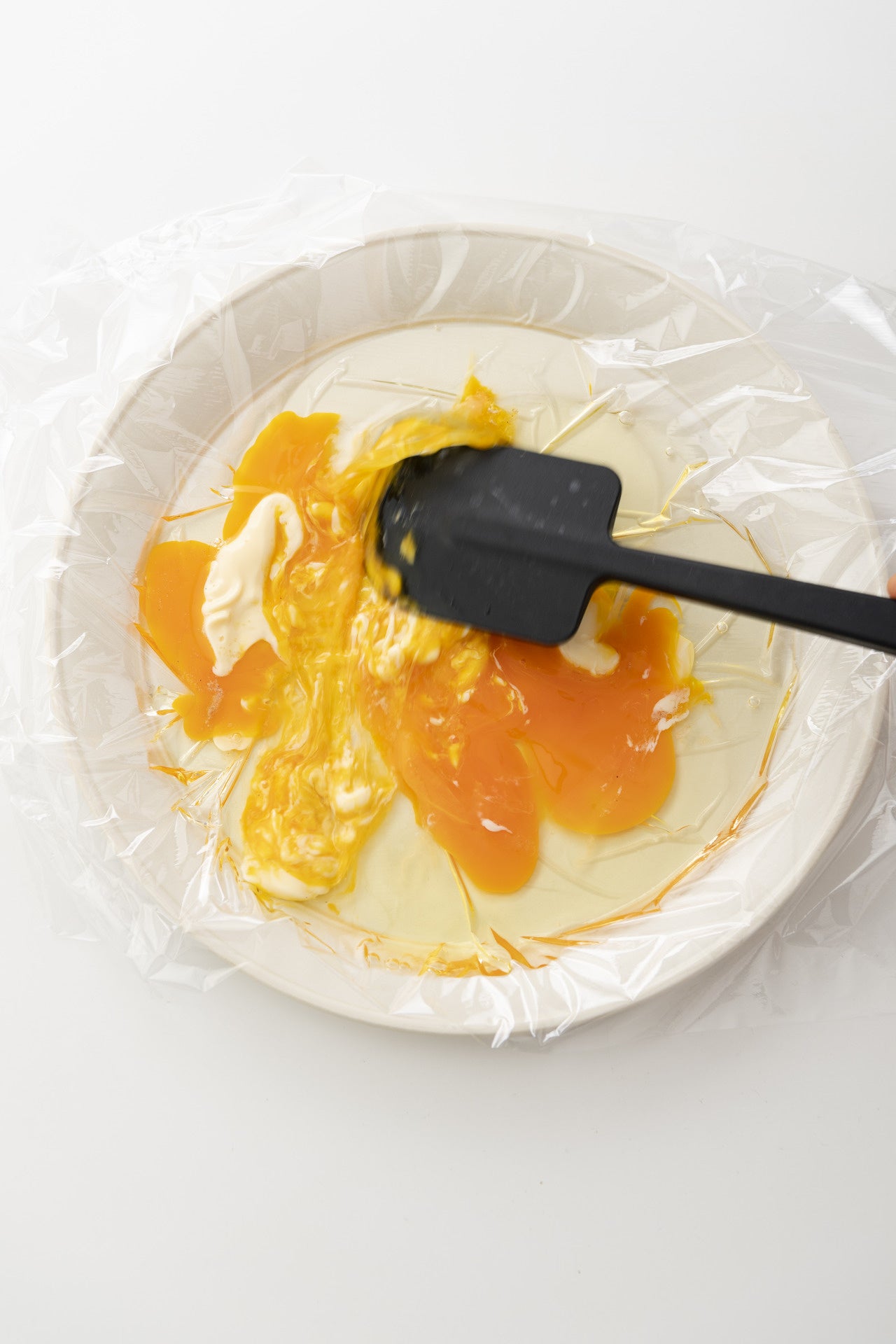 同じ耐熱皿で卵を溶ききほぐしてレンチンし…
