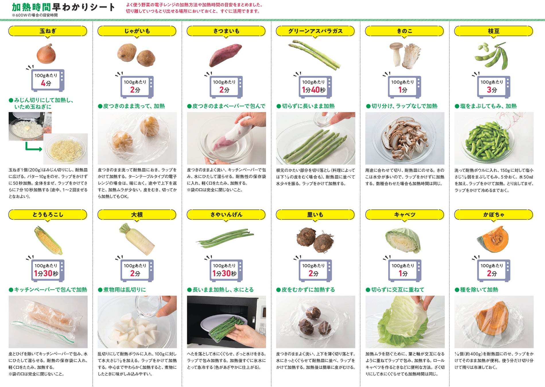 その他上手な解凍の仕方やちょっとした裏技まで、レンチンにまつわる便利な情報もまとめて紹介しています。巻頭には野菜やお肉の下ごしらえに活用できる「加熱時間早わかり表」つき。