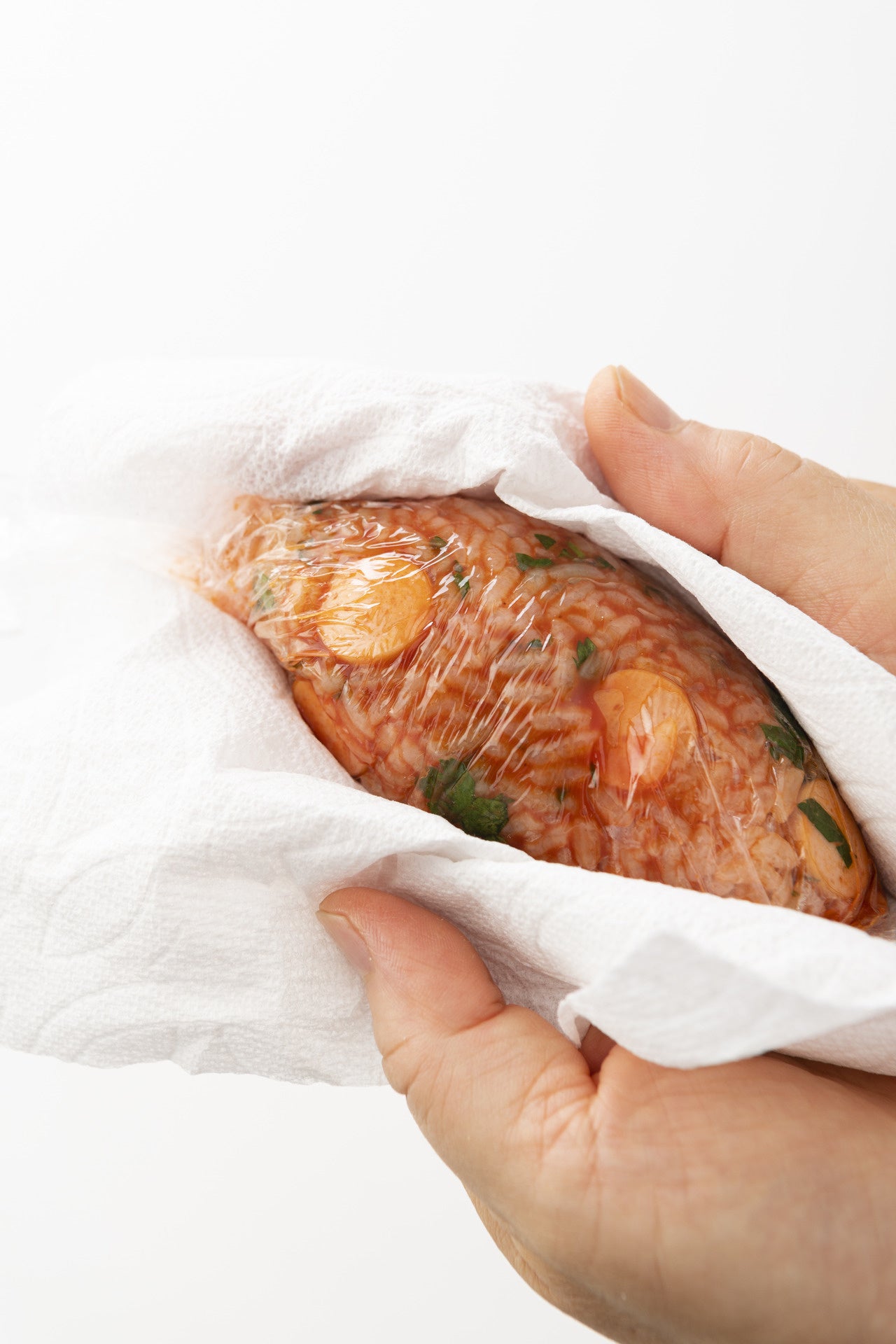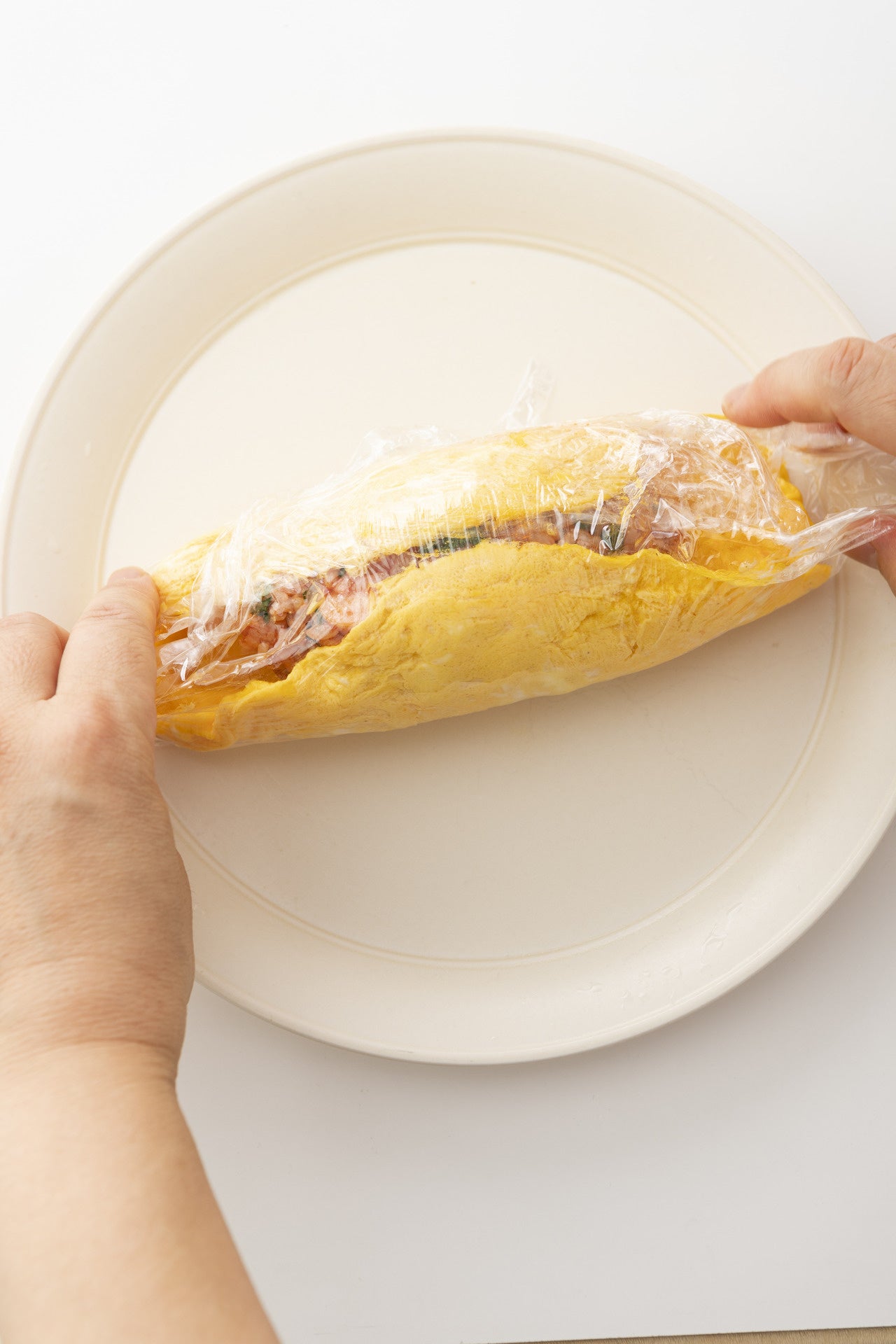 耐熱皿にラップを敷いて、ケチャップライスの材料を混ぜ、そのままラップで包み…