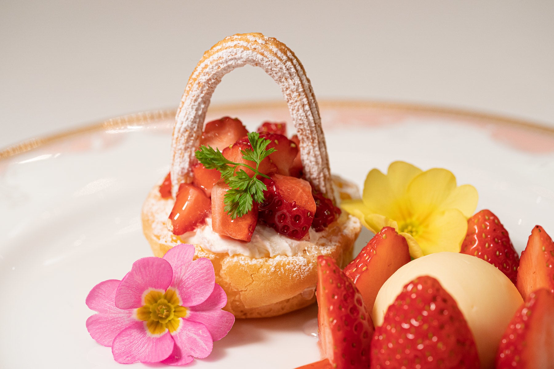 東京會舘自慢の洋食のほか、和食・デザート、寿司などが楽しめる特別食堂 日本橋からは、持ち手付きのバスケットに見立てたシューにカスタードと「いちごさん」を飾ったかわいいデザートを提案。パニエはフランス語で「バスケット」の意味。