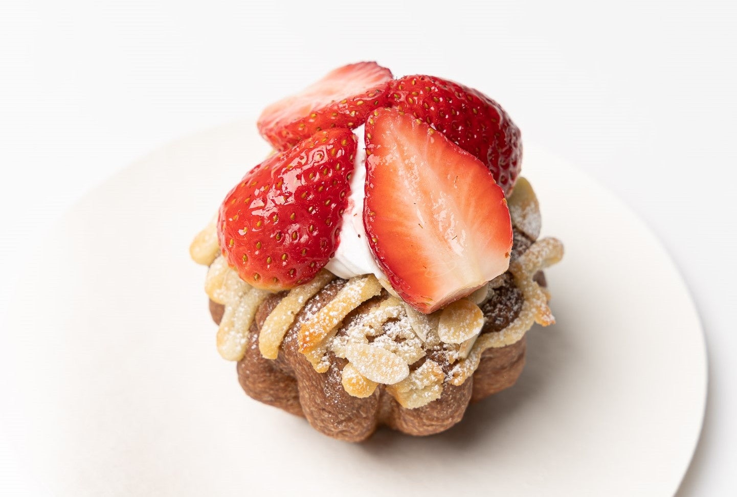 ココア風味のブリオッシュに白いサクサクの生地をトッピング、いちごさんの鮮やかな断面が映えるようにたっぷりのせました。口どけのいいブリオッシュとフレッシュないちごさんの風味をお楽しみください。