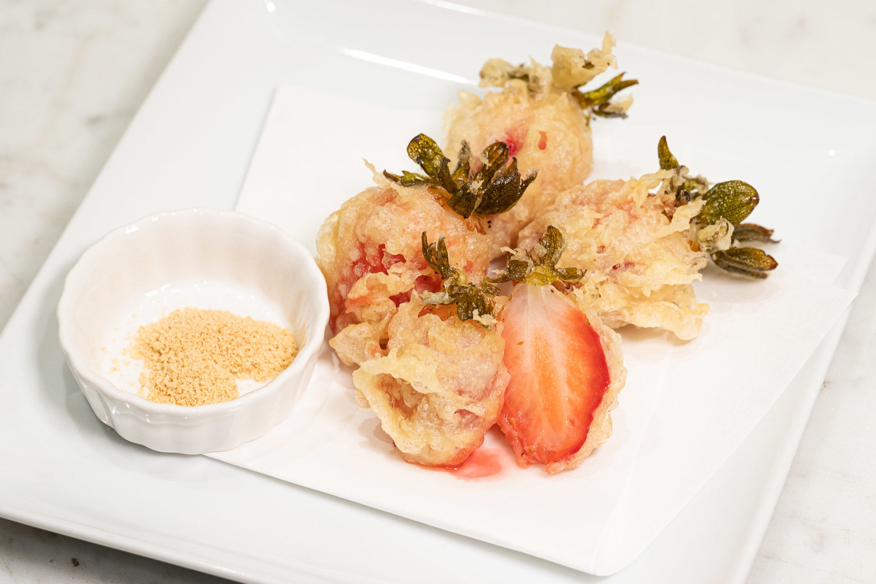 天ぷらと江戸打ち蕎麦が人気の銘店。しっかりとした果肉だからこその色と甘味が楽しめるいちごの天ぷらです。蜜になるお砂糖とともにお楽しみください。