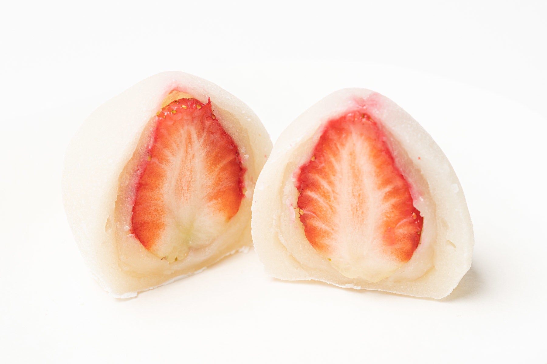 老舗和菓子店〈榮太樓總本鋪〉からは白あんのしっとりした甘さのいちご大福。店内厨房で作られたいちごの甘酸っぱさとあんこの甘みが調和した一品。