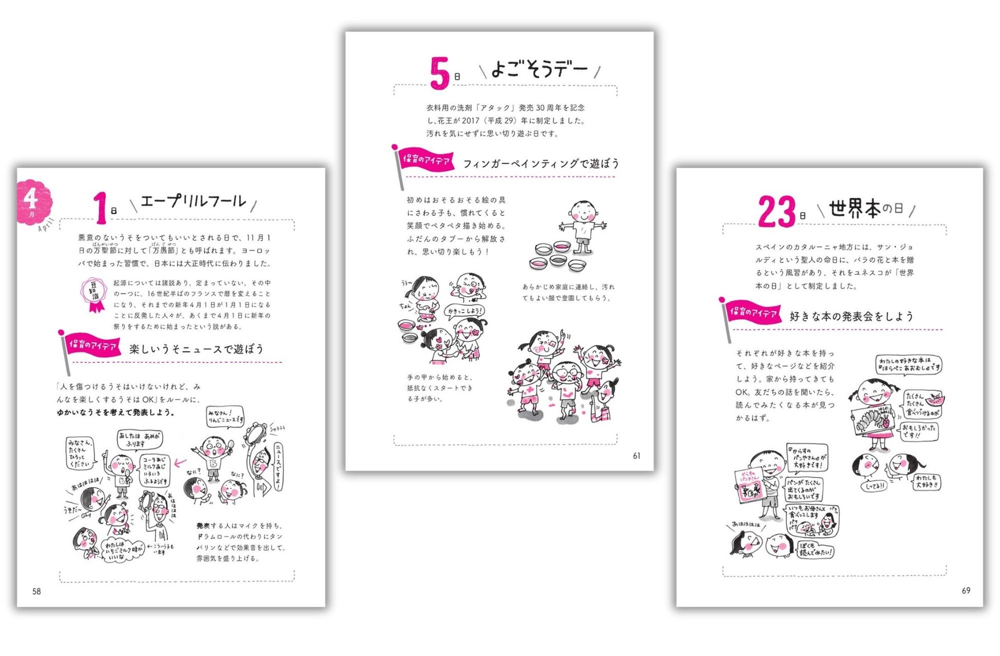 本書は、伝統的な季節の行事から歴史的な出来事のメモリアルデー、語呂合わせのおもしろ記念日まで、366 日すべてをカバーしたカレンダー本です。もともとは保育士さんが朝のスピーチやお便りの話題を見つけるための本ですが、ご家庭で伝統行事や四季折々の風物について、小さなお子さんに説明するときにも重宝します。