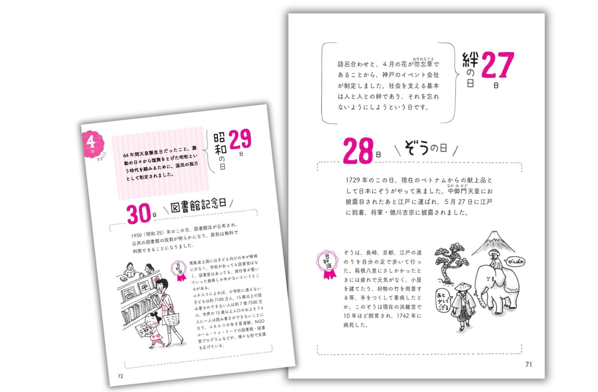 単なるカレンダー本ではなく、記念日について深く知ることができるのが本書の特徴です。「豆知識」で、記念日にまつわる歴史的な出来事など、興味深いうんちくを掲載しています。お子さまとのコミュニケーションにも最適です。