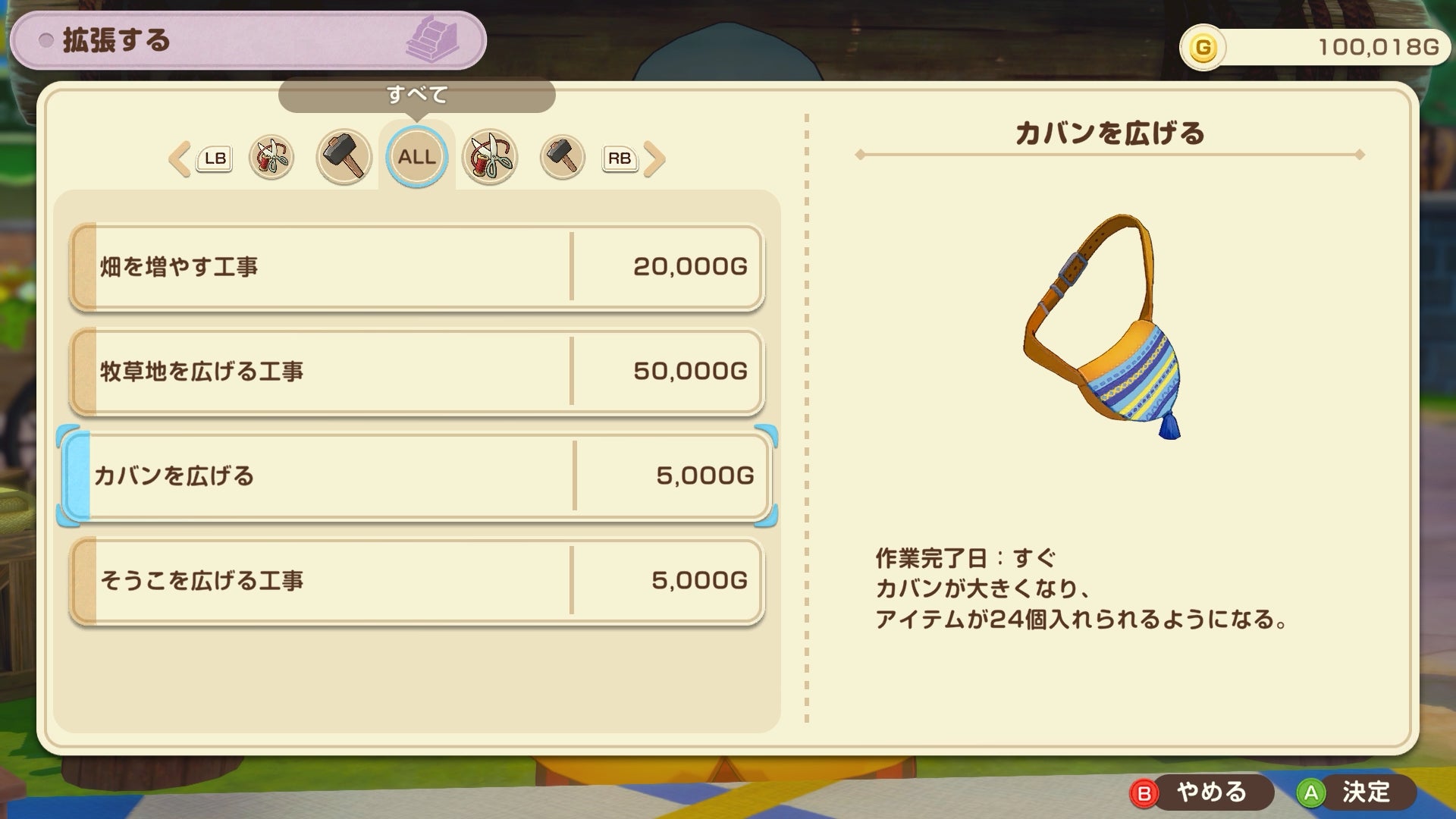 新たな畑や動物小屋を作ったり、カバンのサイズを広げてもらったり……。