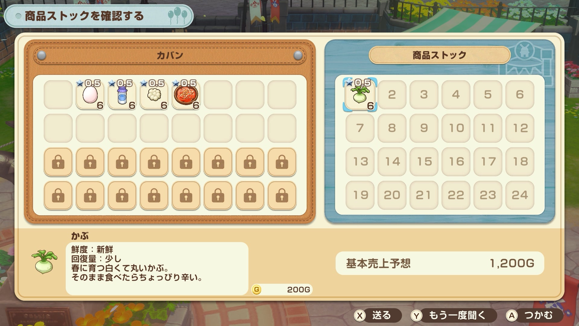 牧場主であるあなたはここにお店を出店し、牧場生活や町などで手に入れた自然の恵みをたくさんの人たちに販売し、得たお金でどんどん牧場を豊かにすることができます。