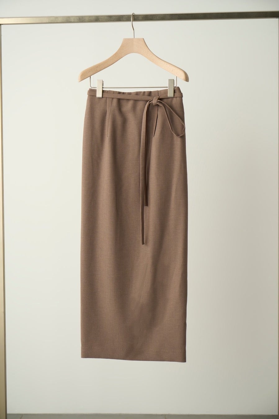 長めのウエストベルトが特徴的なペンシルスカート。ベルトは腰に巻き付けて、前後で結べるデザイン。