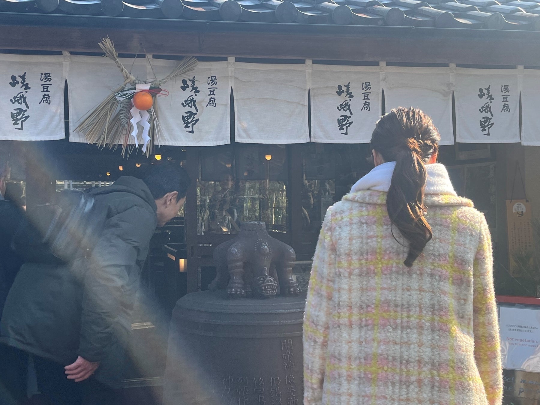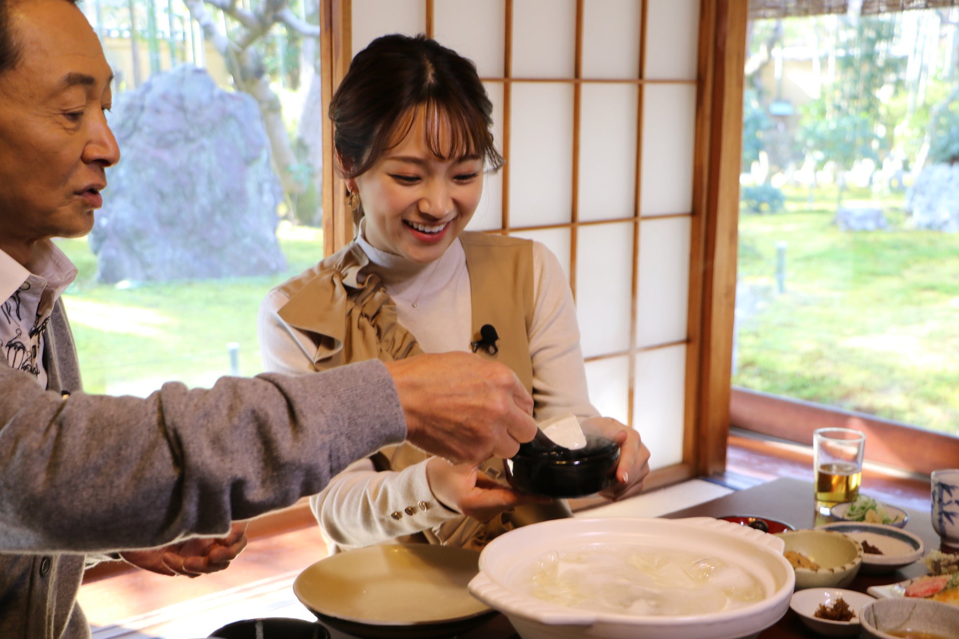 寒い冬の京都。まずは湯豆腐でほっこり暖まりましょう。ということで三田村がプライベートでも何度も訪れている1965年創業、嵐山の【湯豆腐 嵯峨野】へ。素敵なお庭を眺められるお部屋で『湯豆腐定食』をいただきます。