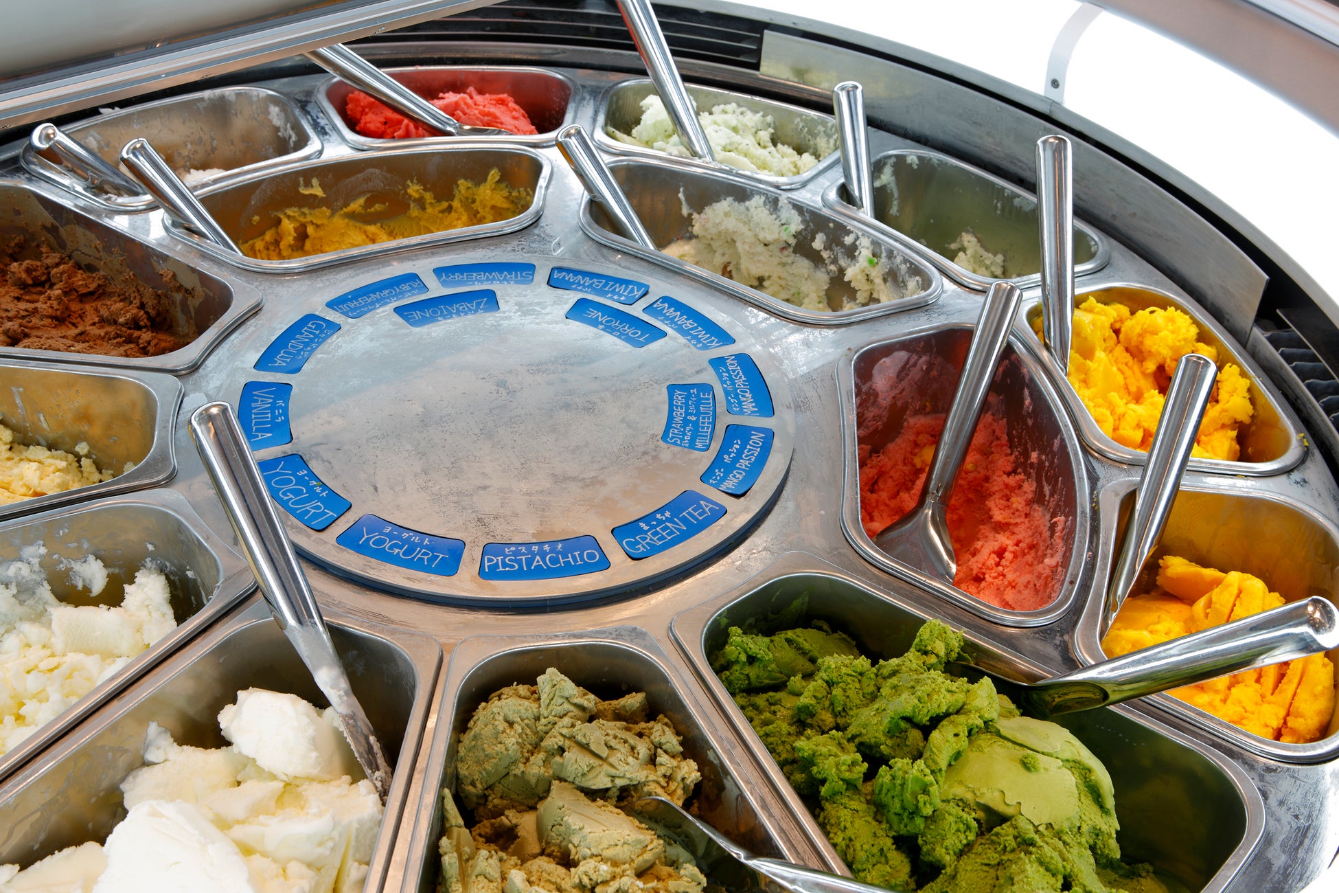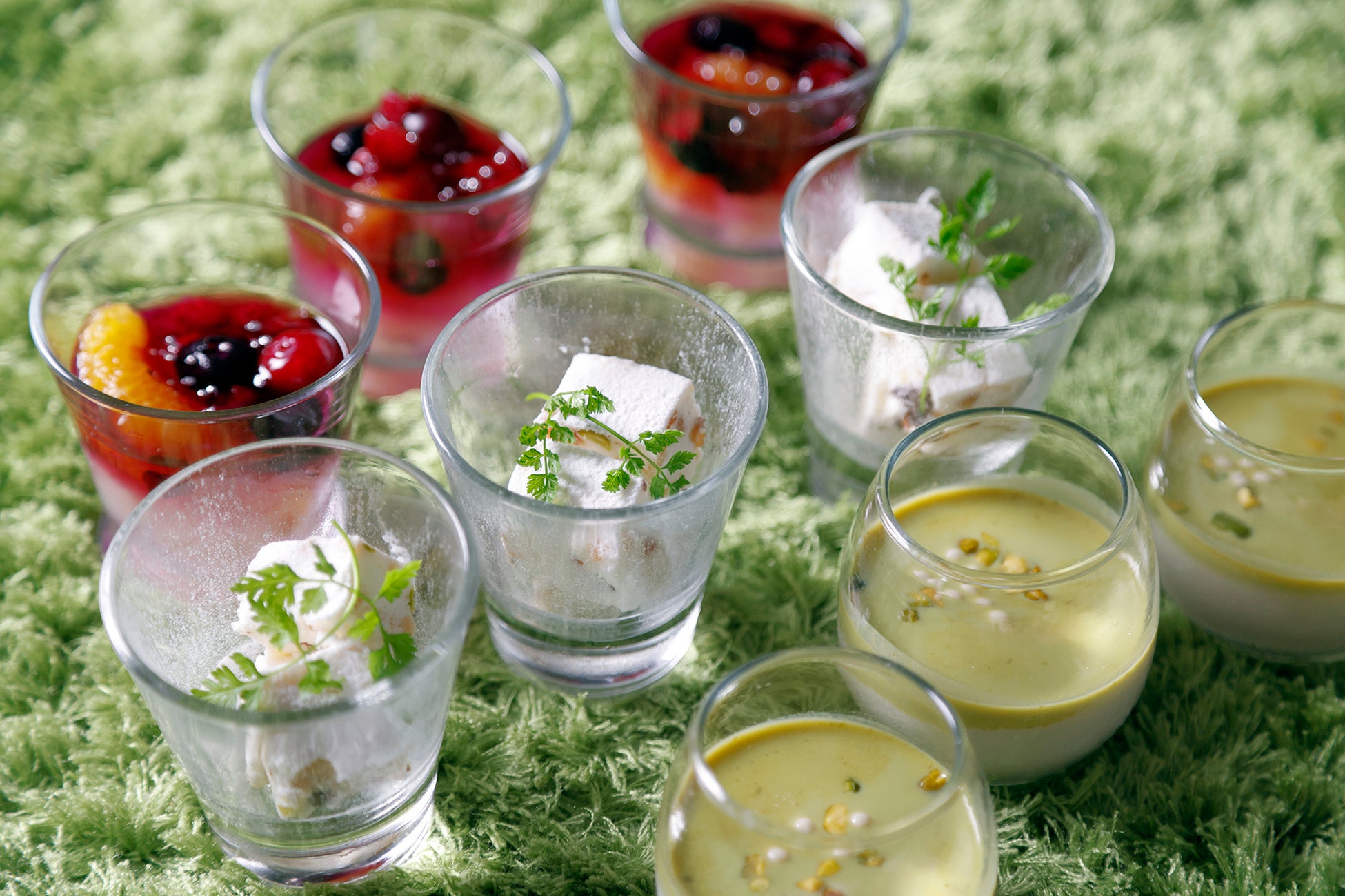グラスデザート 3種(紅茶のパンナコッタとピスタチオソース/マチェドニア/カッサータ ヴェリーヌ仕立て)/ティラミス ※1/ブリュレチーズケーキ(ワゴンスイーツ)※1/ジェラート 10種/ポップコーン