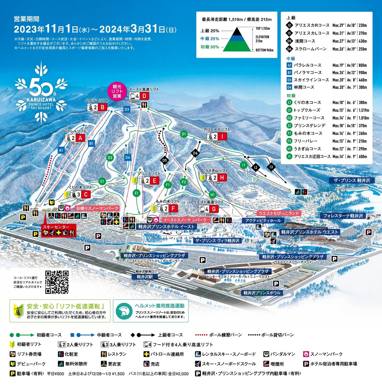 今シーズン、開業50周年を迎える軽井沢プリンスホテルスキー場では、「今までの感謝の50年、これからの進化の50年」をコンセプトに、50周年を記念した特別なスキー体験ができるプランの販売やイベントの開催、飲食メニューをご用意するのはもちろん、ウインタースポーツをしない方でも楽しめるアクティビティや、安全に安心してお楽しみいただくためにケガ防止につながる取り組み、お子さまや若年層のスキーデビューを応援する取り組みなどを実施し、2024年3月31日(日)まで営業いたします。