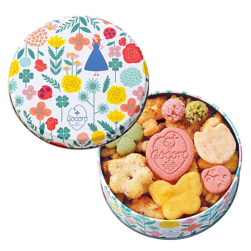 手にとった方々に、幸福が訪れるように願いを込めて、ココロを込めて、ひとつひとつ丁寧に作り上げたかわいいお菓子です。さまざまな味と形のおかきと、幸せを運ぶとされる世界中のラッキーチャームをかたどったカラフルな米粉入りクッキーを愛らしい缶に詰合せました。