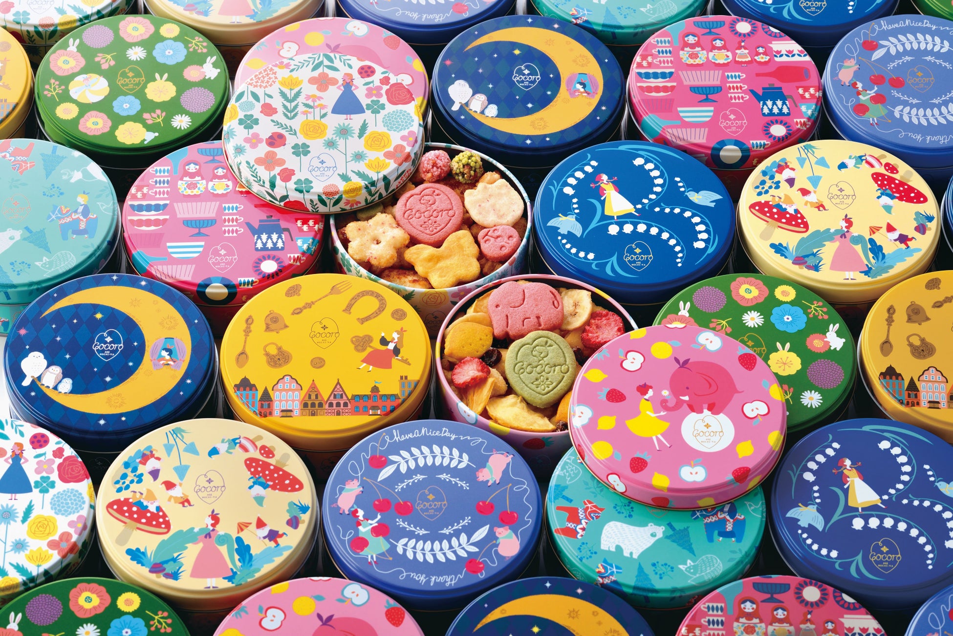 世界中のラッキーチャームをかたどった米粉入りクッキーが入った「あげもちCocoroミニ缶」