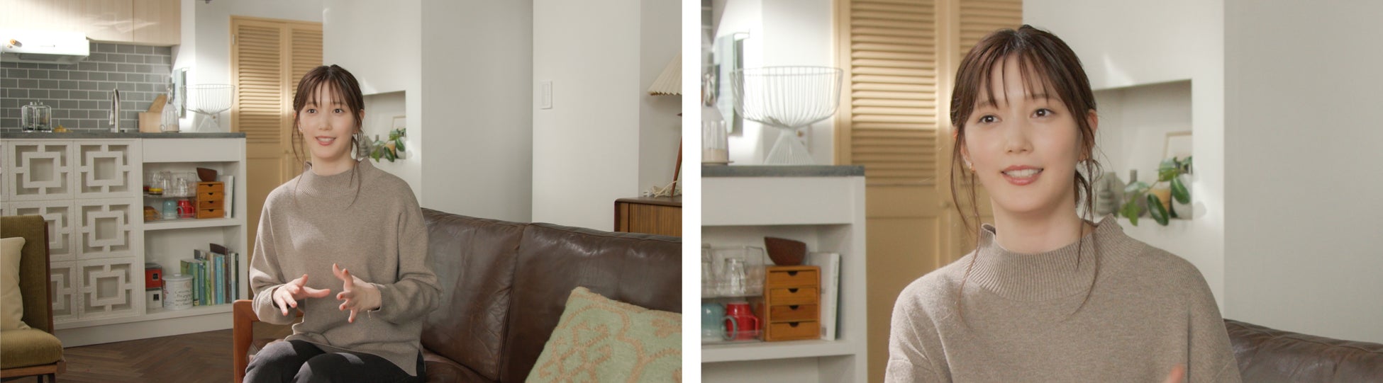 ―今日の撮影は“冬”がテーマになっています。日常の生活の中で「メルティニット」を着用して過ごす様子を演じさせていただきました。わんちゃん(バディーくん)と生活する様子も撮影したので、普段の自分の生活に近い感じでとても楽しく撮影をすることができました。