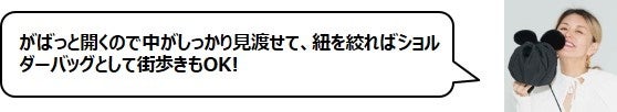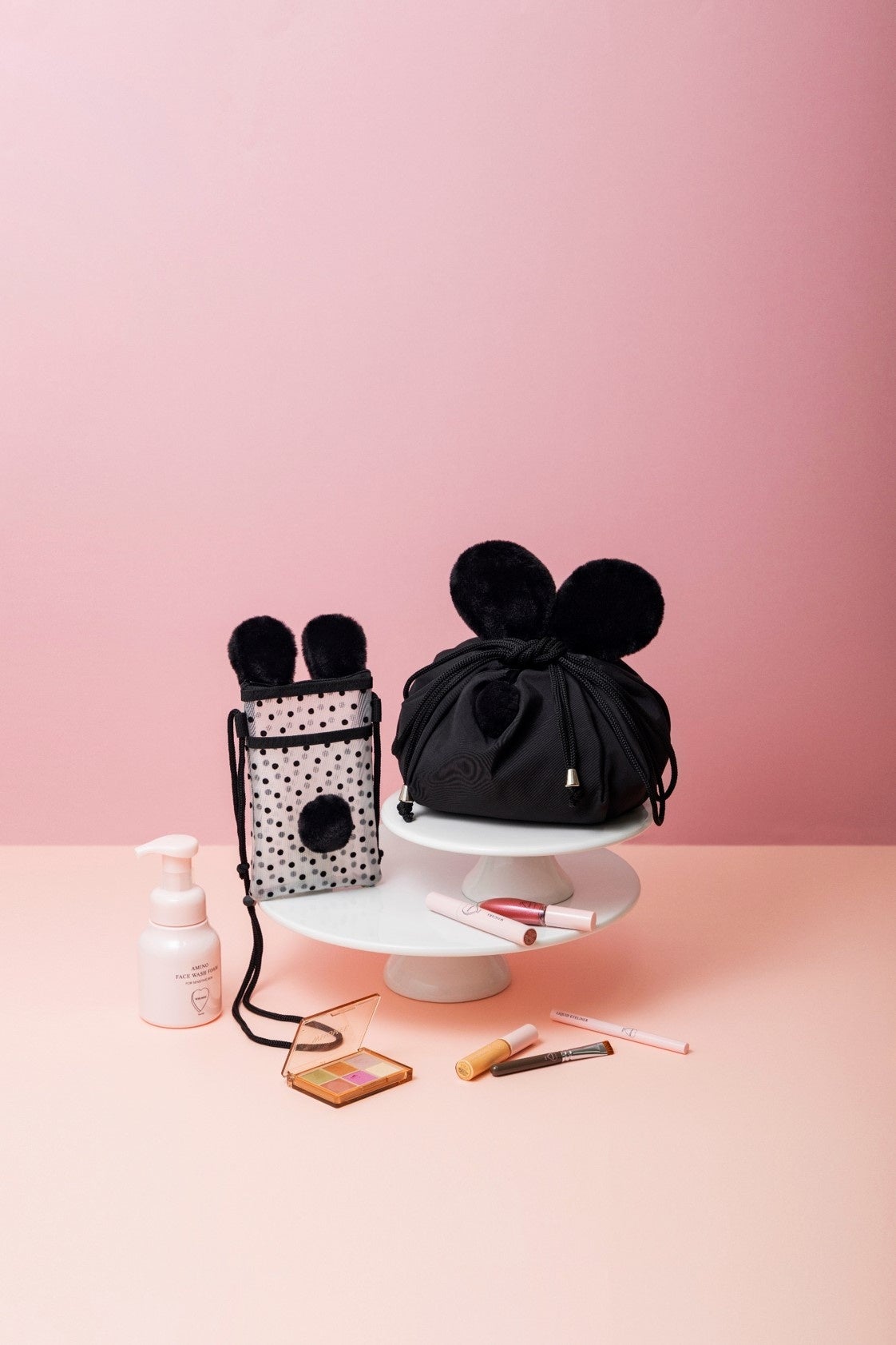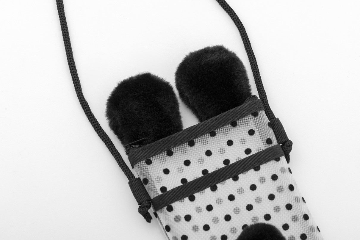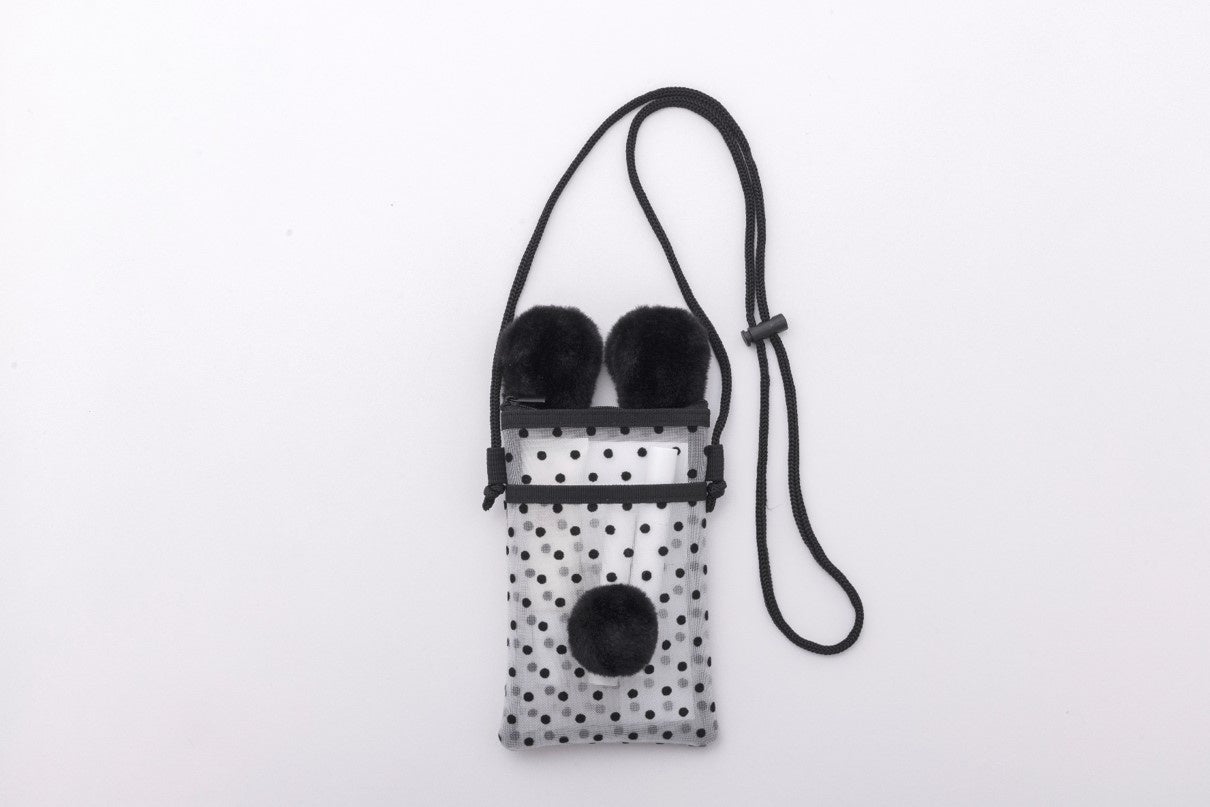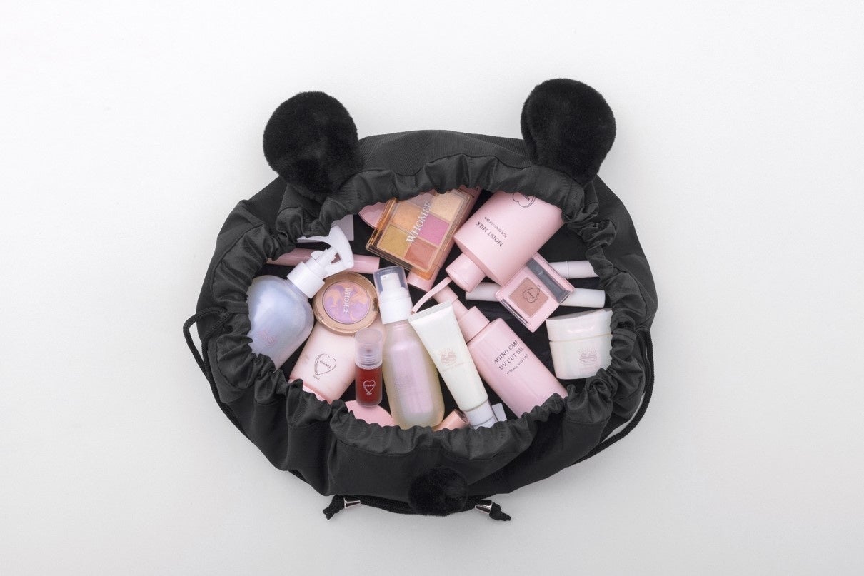 スペシャルアイテムは、フワフワの耳としっぽが付いたコスメポーチ2点セット。ちょっとした外出にも便利な、スマホが入るシースルーのミニショルダーポーチと、コスメをがぼっと収納できる巾着ポーチの豪華なセットです。イガリさんの「すべてにおいて“楽しく”」というモットーから、どちらもクマ耳としっぽのポンポンを付けたのがポイント。使いやすさと遊び心にこだわり、何度も試作しました。ショルダーバッグとして斜め掛けできるポーチは持ち運びやすく、ありそうでなかった優れものです。