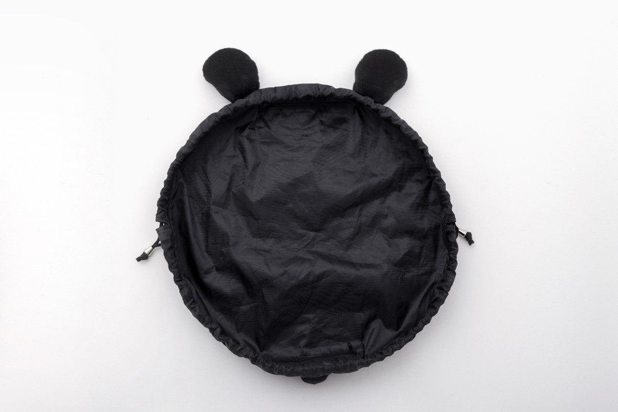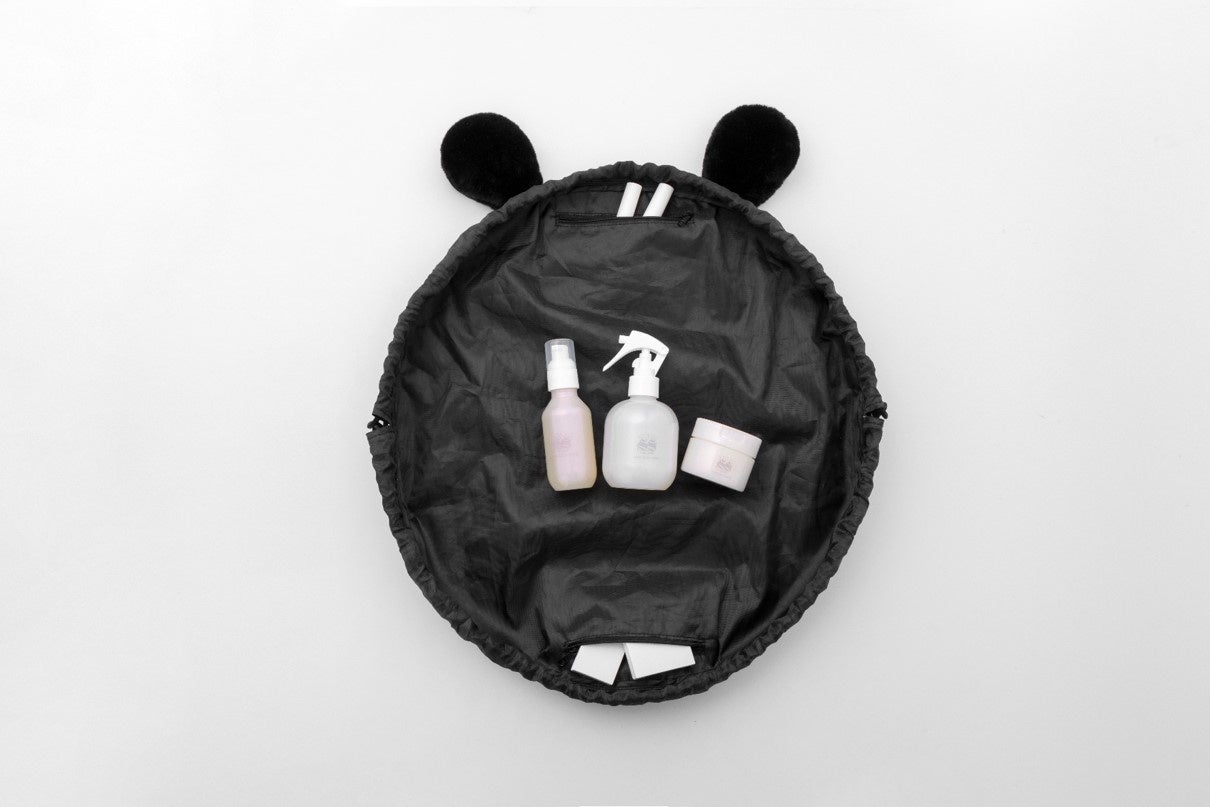 大容量のポーチって綺麗に収納すると、結局奥にあるものは使わなくなったりしますよね。きんちゃくポーチは風呂敷のように広げられ、メイク台に敷くマットにもなるし、紐を絞ればそのまま持ち運べるんです。ミニショルダーポーチは、最小限の荷物だけを持ち運べるように作りました。すべてにおいて「楽しく」というのがモットーなので、どちらもクマ耳としっぽのポンポンを付けたのがポイントです。