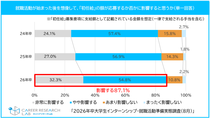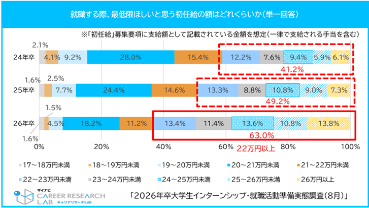 約 8 割の学生が「初任給」の額が本選考への応募に影響すると回答。最低限ほしい初任給の額は22万円以上が増加【図 3、4】
