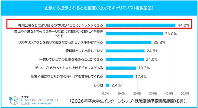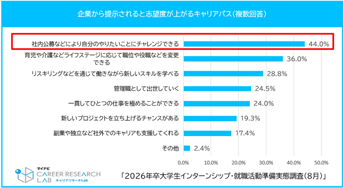 企業から提示されると志望度が上がるキャリアパスについて聞いたところ、「社内公募などにより自分のや