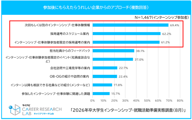 ◆学生がインターンシップ・仕事体験参加後にもらえるとうれしい企業からのアプローチは「次回のインターンシップ情報や選考に関する案内」