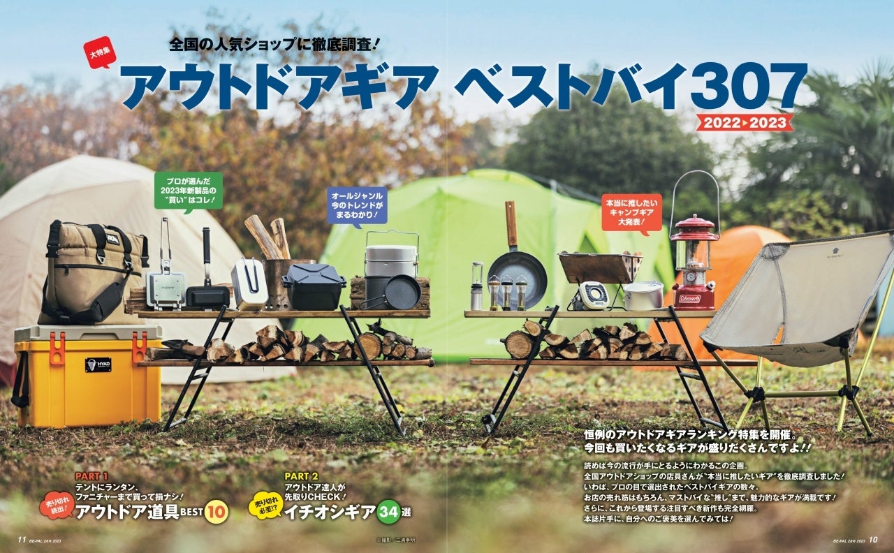 さらに、今号の大特集は「アウトドアギアベストバイ307」。全国の人気ショップで売り切れ続出、今買うべきアウトドア道具を徹底調査。ファミリーテントにソロテント、タープに焚き火台、シュラフにチェア、シューズまで全307アイテムをご紹介。2023年の注目ギアも、先取りチェックしています!