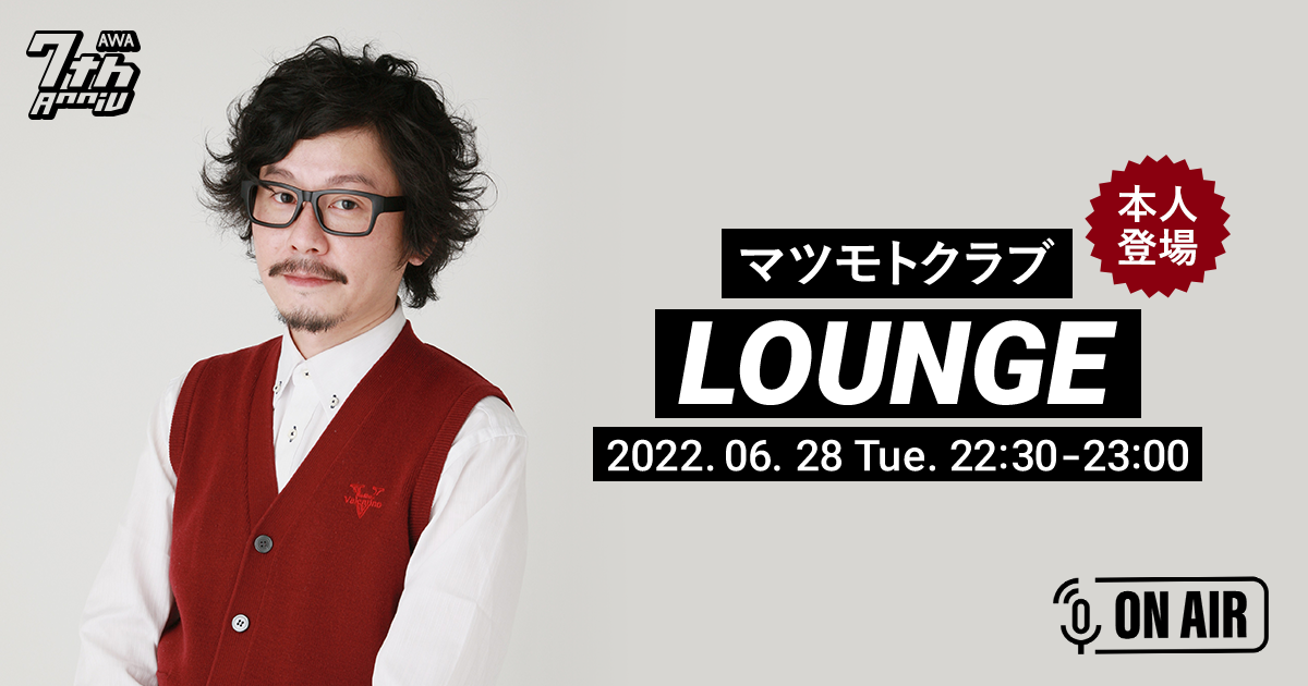AWA株式会社(本社:東京都港区、代表取締役CEO:冨樫晃己)が運営する、サブスクリプション型(定額制)音楽ストリーミングサービス「AWA(アワ)」は、2022年6月28日(火) 22:30~23:00の 30分に渡り、誰でも無料で参加できるオンライン空間「LOUNGE(ラウンジ)」で、マツモトクラブが音声とチャットで参加する、ラジオ配信ラウンジを開催いたします。