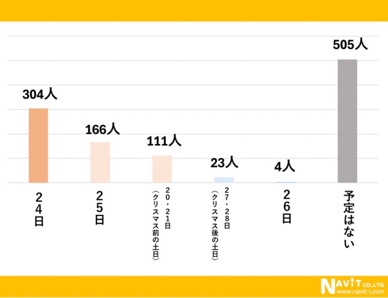 クリスマスのお祝いをするタイミングについてのアンケートを複数回答可で実施しました。結果、お祝いするひとと人とお祝いの予定がない人でおおよそ半々で、お祝いをする人の中ではクリスマスイブである「24日」が最も多い304人という結果になっています。