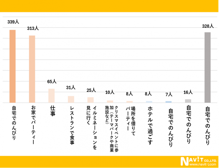 クリスマスの予定についてのアンケートも複数回答にていただきました。最も多かったのが「自宅でのんびり」で339人、そして「お家でパーティー」が313人と、自宅で過ごす人が多いことが分かる結果となりました。