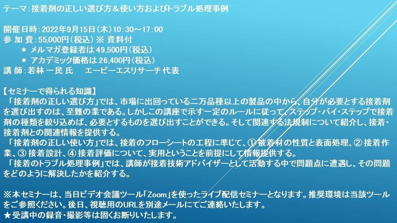 先端技術情報や市場情報を提供している(株)シーエムシー・リサーチ(千代田区神田錦町: https://cmcre.com/ )では、 各種材料・化学品などの市場動向・技術動向のセミナーや書籍発行を行っておりますが、 このたび「接着剤の正しい選び方&使い方およびトラブル処理事例」と題するセミナーを、 講師に若林 一民 氏 エーピーエスリサーチ 代表)をお迎えし、2022年9月15日(木)10:30より、 ZOOMを利用したライブ配信で開催いたします。 受講料は、 一般:55,000円(税込)、 弊社メルマガ会員:49,500円(税込)、 アカデミック価格は26,400円(税込)となっております(資料付)。