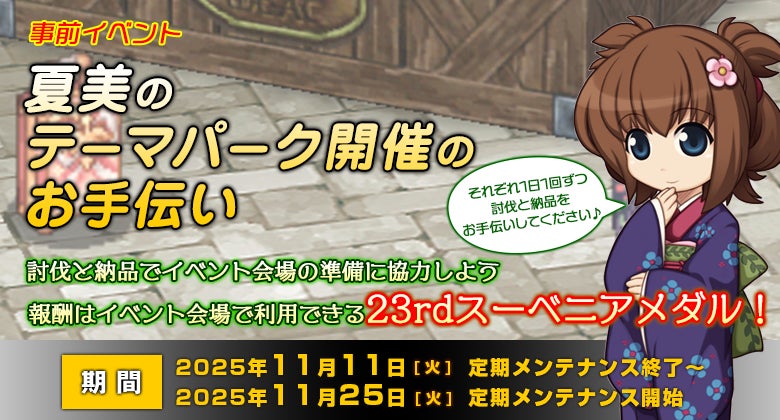そこで『ラグナロクオンライン』では、2025年11月11日(火)定期メンテナンス終了から2週間、事前イベント「夏美のテーマパーク開催のお手伝い」をスタート。1日1回討伐クエストと納品クエストを行い、イベント会場準備のお手伝いをしていきましょう。依頼を達成すればそのお礼としてBase&JobEXP、アニバーサリーイベント開始時にイベント会場で利用可能な「23rdスーベニアメダル」を受け取ることができます。