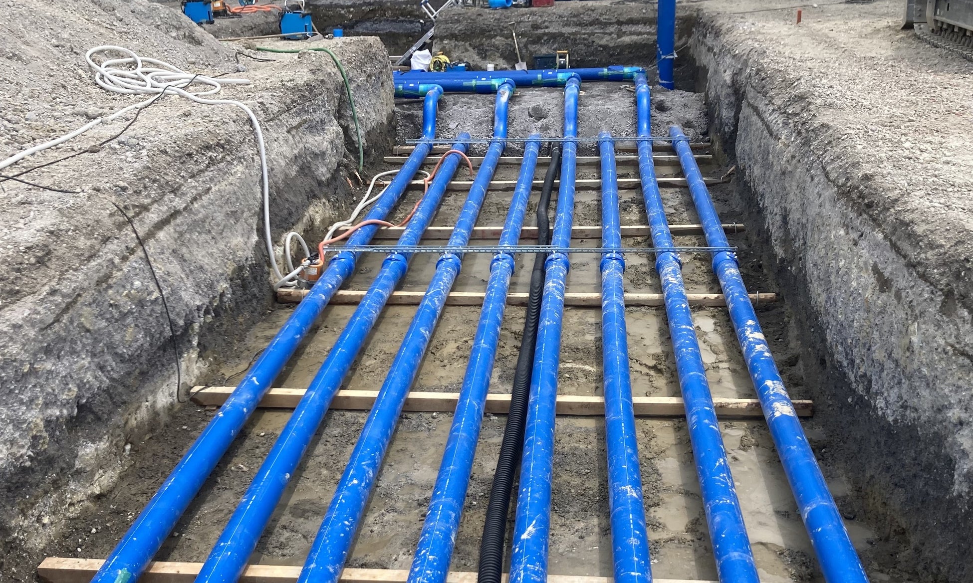 本拠点では、地中熱ヒートポンプを利用した空調システムを導入します。国内の地中熱利用では最大規模となる200本の地中熱交換器を実装し、地下100mより安定した熱エネルギーを取り出します。これを1階部分の冷房および暖房に利用することで、低エネルギーで室温を快適に保ちます。本システムの導入により、従来の空調と比べて約30%のエネルギー消費量削減が見込まれます。これはAmazon全体の物流拠点においても先進的な取り組みです。