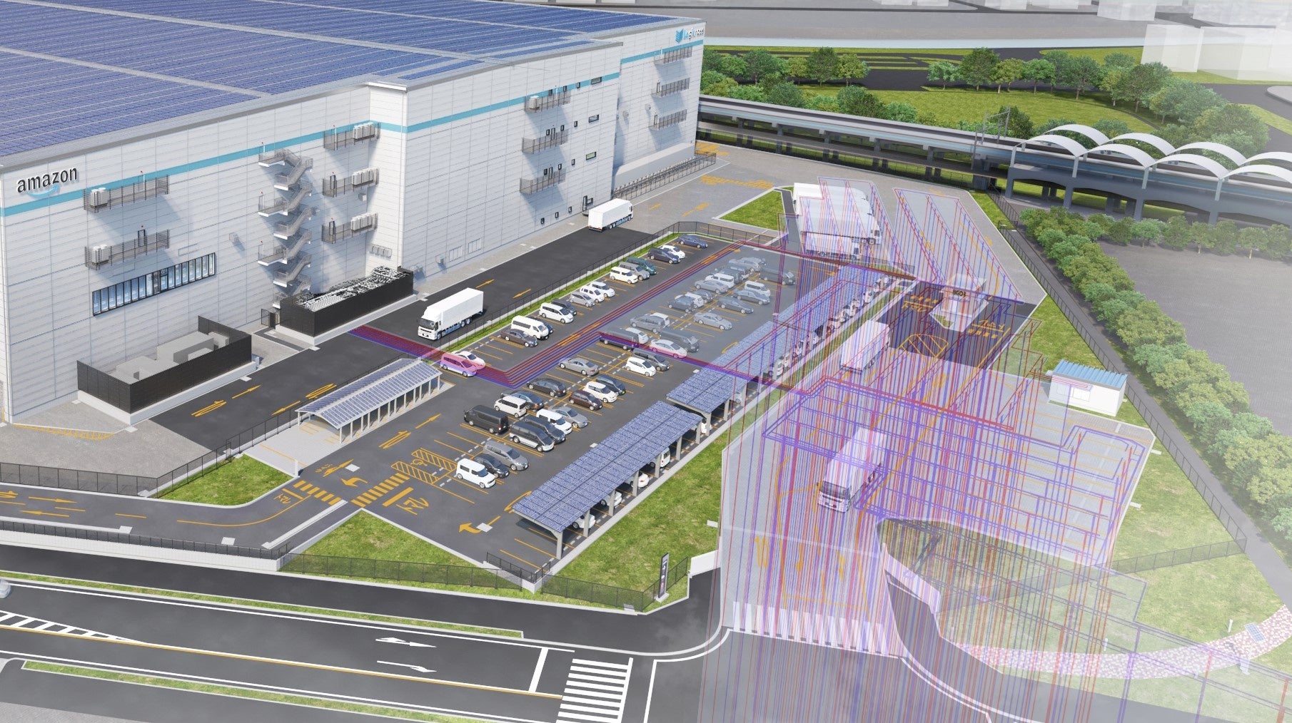 また、本拠点で使用される電力の一部を賄うため、建屋および駐車・駐輪場の屋根部分に太陽光発電設備を設置するとともに、Amazonとして世界で初めて建屋の壁面(南側)にも太陽光発電設備を導入します。合計の発電設備容量は5.5メガワット(MW)となり、国内の物流施設に設置されているオンサイト型の太陽光発電としては最大級、Amazonのオンサイト型の太陽光発電としては米国外で最大の発電設備容量となります。さらに、蓄電容量2.9メガワット時(MWh)の蓄電池も併設し、雨天・曇天時や夜間でもカーボンフリーエネルギーを活用できます。