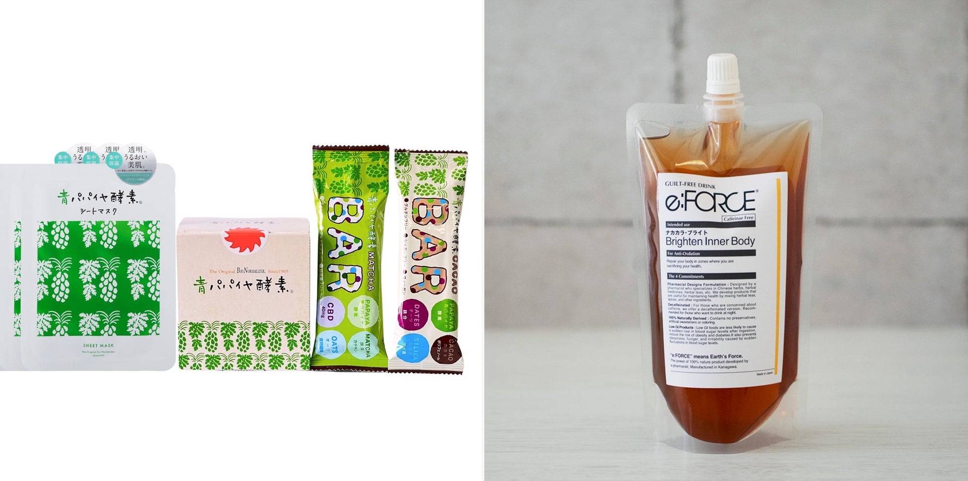 ビタミンやミネラルが豊富な青パパイヤを加工した健康食品とシートマスクが入った「青パパイヤ酵素」のキット、フラボノイドとSOD酵素を含むルイボスに、ローズヒップやハイビスカスなどをブレンドした「イーフォース」のボディケア飲料など、サプリメントやドリンクが登場。