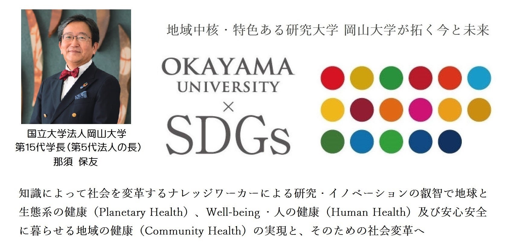 国立大学法人岡山大学は、国連の「持続可能な開発目標(SDGs)」を支援しています。また、政府の第1回「ジャパンSDGsアワード」特別賞を受賞しています。地域中核・特色ある研究大学として共育共創を進める岡山大学にご期待ください