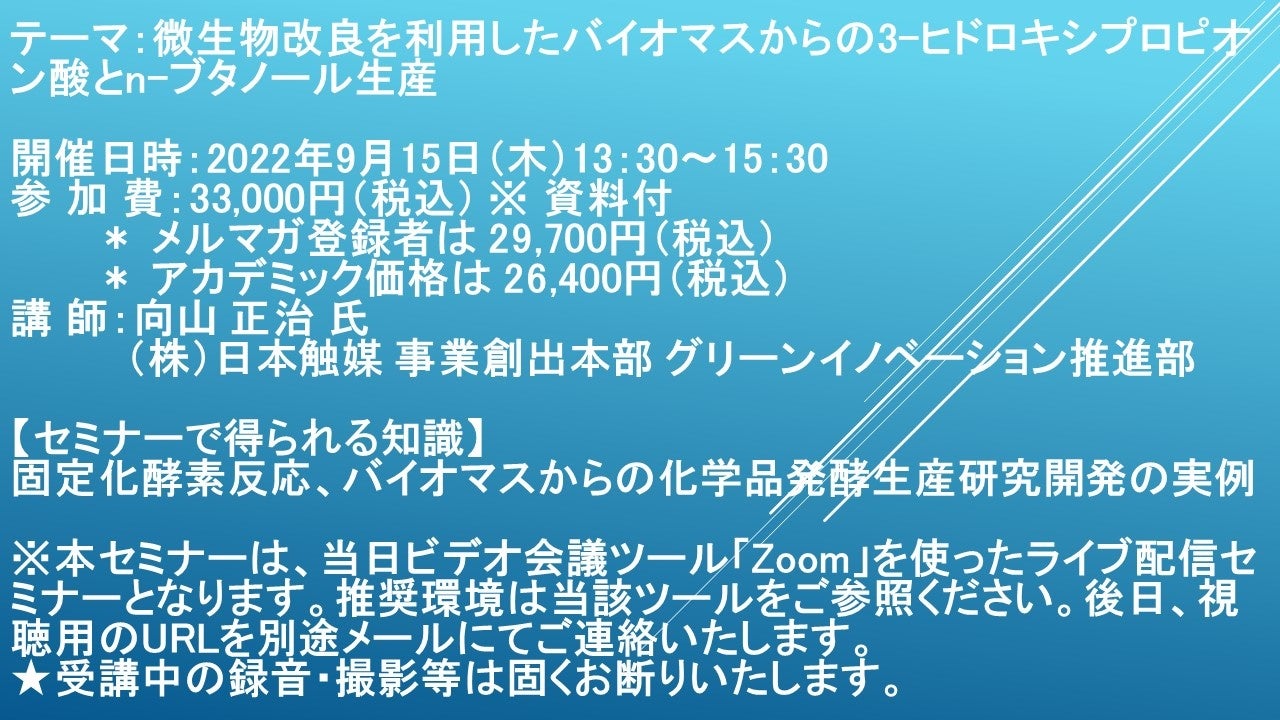先端技術情報や市場情報を提供している(株)シーエムシー・リサーチ(千代田区神田錦町: https://cmcre.com/ )では、 各種材料・化学品などの市場動向・技術動向のセミナーや書籍発行を行っておりますが、 このたび「微生物改良を利用したバイオマスからの3-ヒドロキシプロピオン酸とn-ブタノール生産」と題するセミナーを、 講師に向山 正治 氏 (株)日本触媒 事業創出本部 グリーンイノベーション推進部)をお迎えし、2022年9月15日(木)13:30より、 ZOOMを利用したライブ配信で開催いたします。 受講料は、 一般:33,000円(税込)、 弊社メルマガ会員:29,700円(税込)、 アカデミック価格は26,400円(税込)となっております(資料付)。