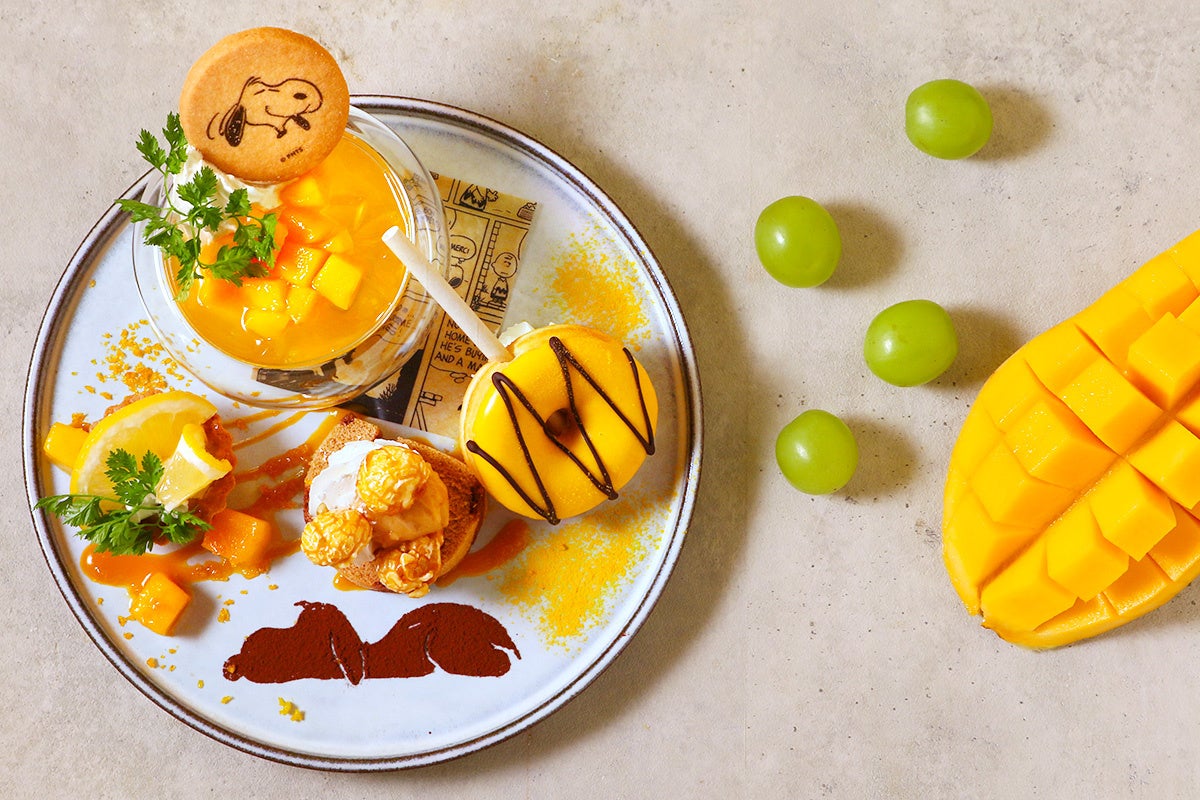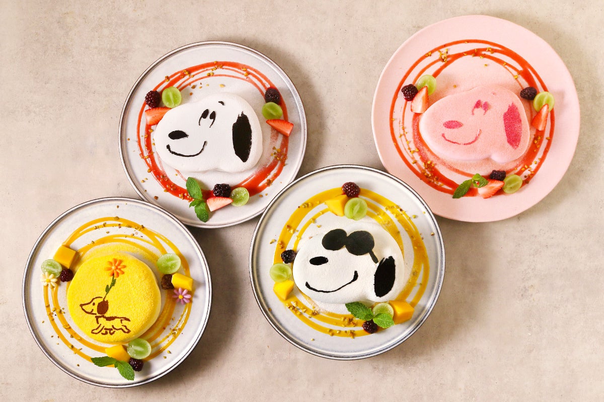 スヌーピーのクッキーがトッピングされたジュレ、チャーリー・ブラウンのギザギザ模様をモチーフにしたミニドーナツやルーシーのレモネードタルト、ウッドストックに見立てたシュウマイなど、スヌーピーと仲間たちをイメージしたスイーツやお食事がお楽しみいただけます。