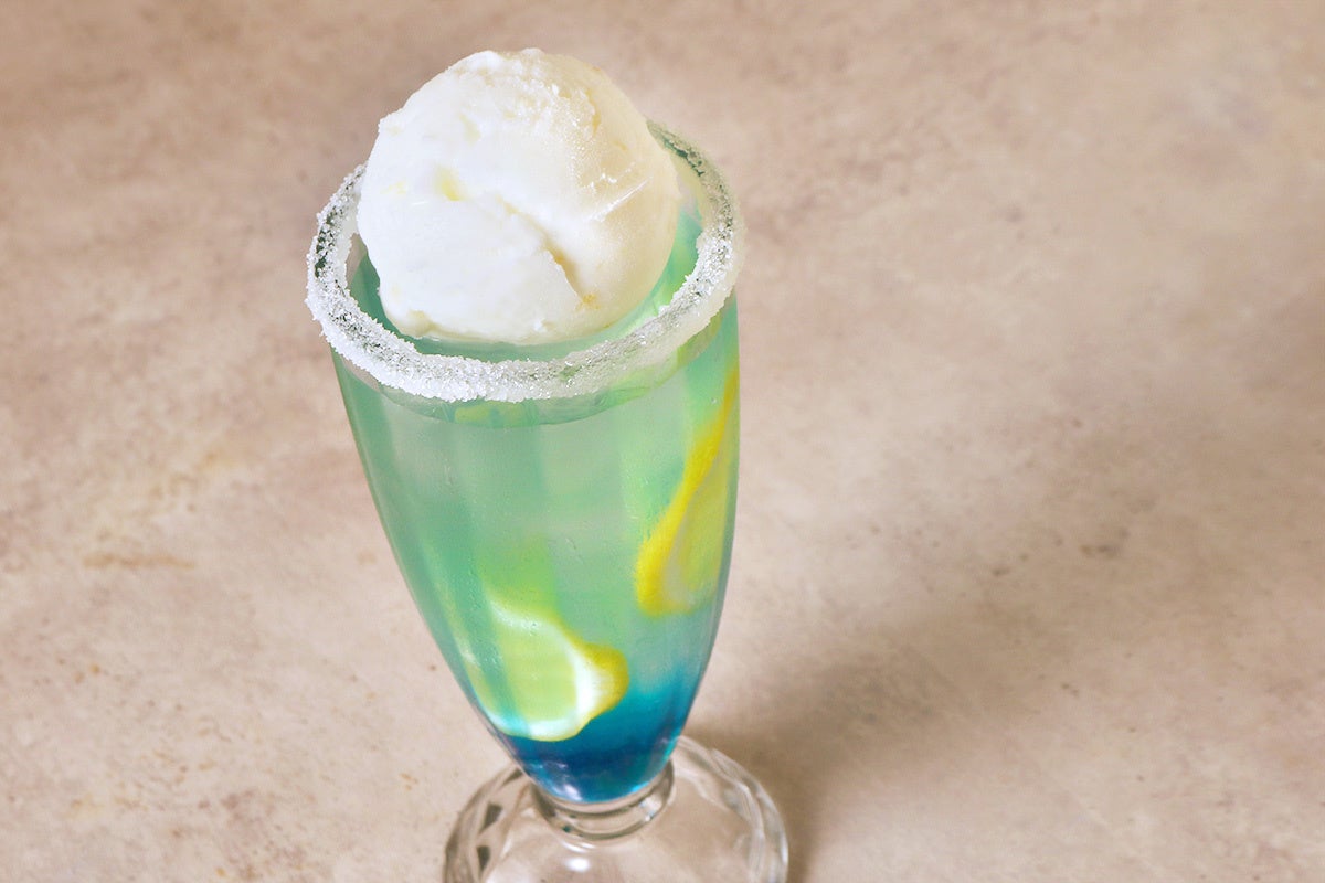 波にかっこよく乗れてCowabunga!と気分上々なスヌーピーをイメージした、鮮やかなスカイブルーのアップルスカッシュ。グラスの縁は砂浜をイメージしました。