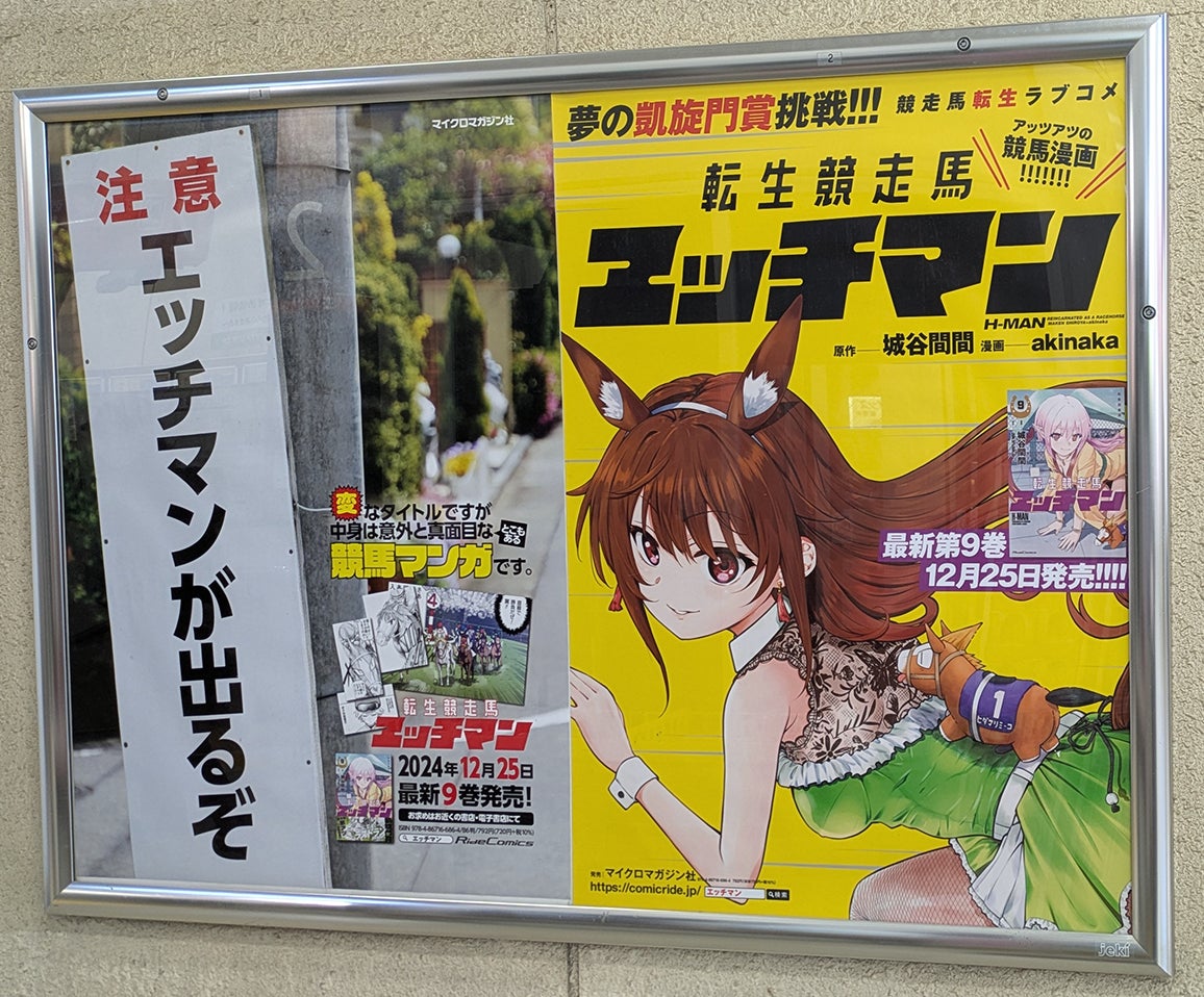 有馬記念直前で盛り上がりを見せるJR船橋法典駅に『転生競走馬 エッチマン9』のポスターが12月30日まで掲出!さらに12月21日(土)秋葉原に歩く広告アドマンによる『エッチマン』が出るぞ!