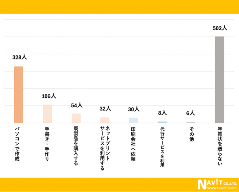 こちらのアンケートも複数回答にていただいております。年賀状の作成方法についてのアンケートでは、「パソコンで作成」という人が最も多く328人、2番目は「手書き・手作り」と回答された人が106人という結果になりました。