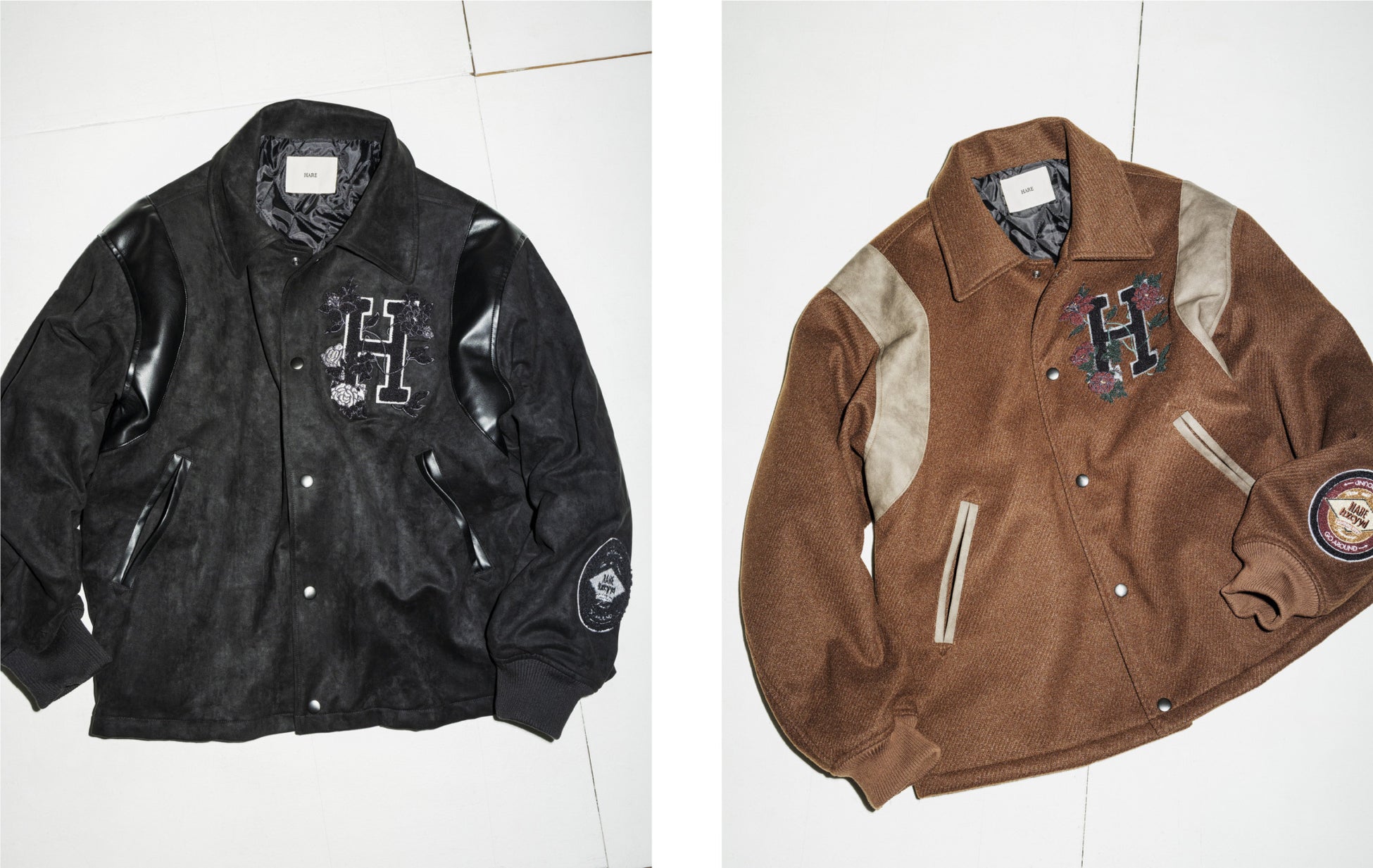 〈ハレ〉と「エクシード」の頭文字である“H”のワッペンがあしらわれたアワードジャケット。ブラックはスエードライクな生地、ブラウンはツイード生地を使用し、それぞれが異なったエレガントな佇まいに。