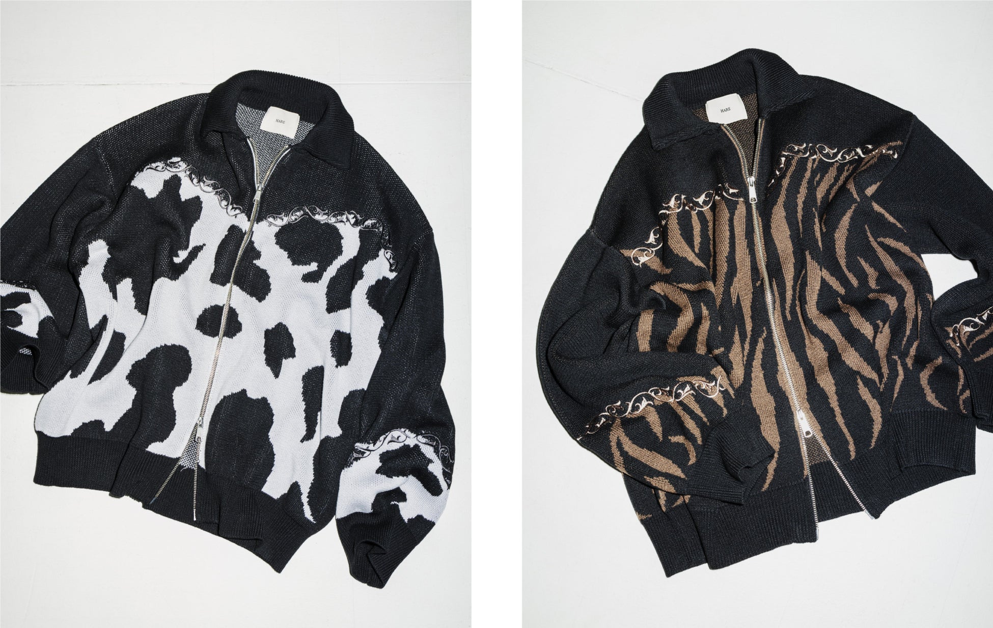「エクシード」で人気のアニマル柄を落とし込んだニットアウターは、切り替え部分に刺繍をあしらい立体感のある一着に。ハードなデザインをニットで柔らかく表現し、繊細かつしなやかな糸を使用することでモダンな印象にアップデートしています。