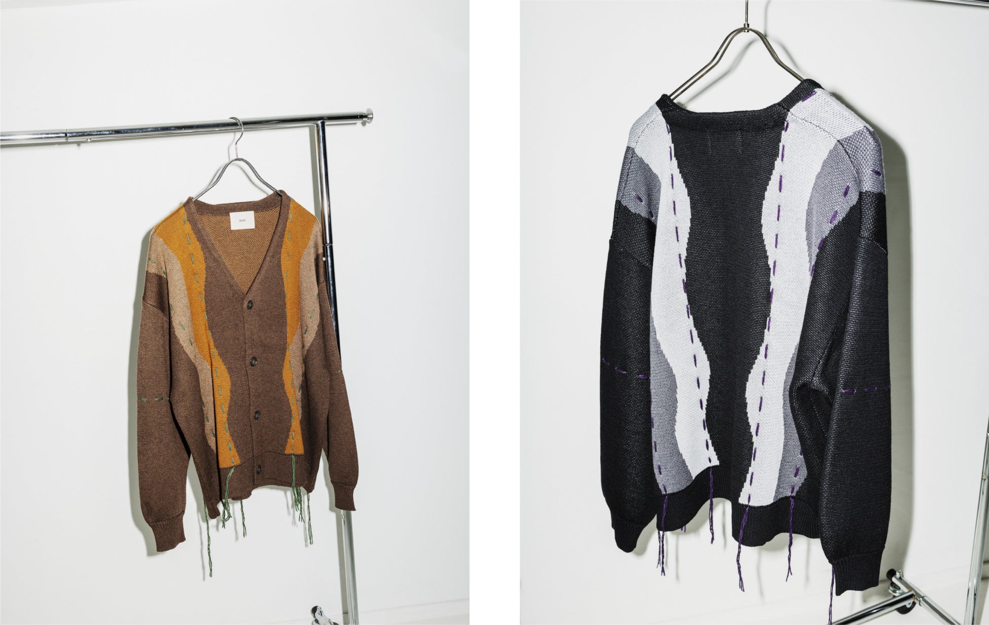 古着でよく見られる縦にラインが走った切り替えカーディガン。それをウェーブ状にアレンジし、ボディと袖からフリルのように紐が垂れるデザインに。