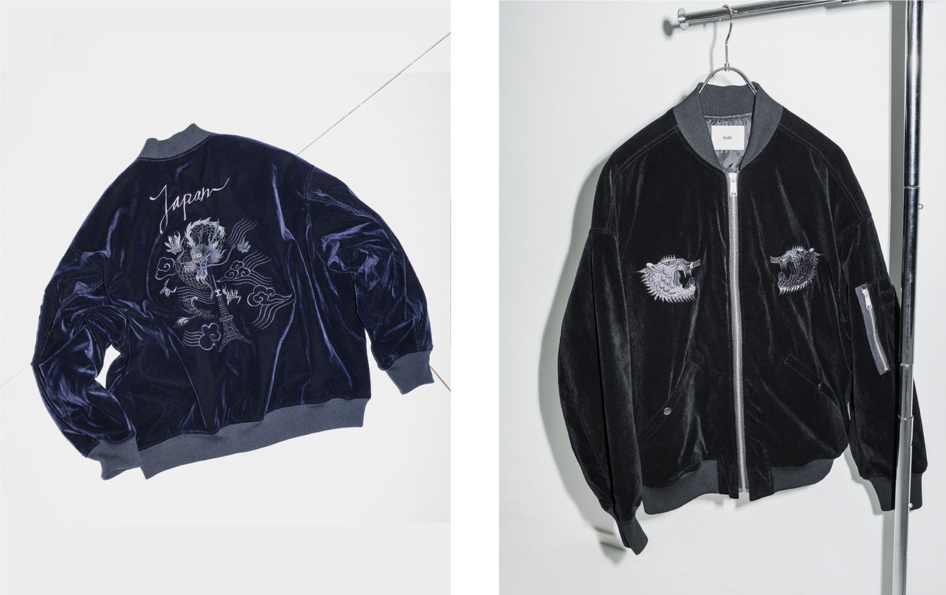 虎と龍、そして東京タワーをモチーフにしたオリジナルの刺繍をあしらったスーベニアジャケット。ヴィンテージでは一般的にサテン地が採用される中、微光沢のベロア素材を使うことで、夜気をまとったようなモードな一着へとアレンジ。