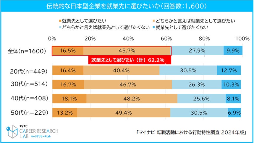 年功序列や終身雇用など、いわゆる伝統的な日本型企業について、直近1年間に転職活動をした人(転職者・転職活動者)の62.2%が「就業先として選びたい」と回答し、日本型雇用を肯定的に捉えている人が半数を超えた。