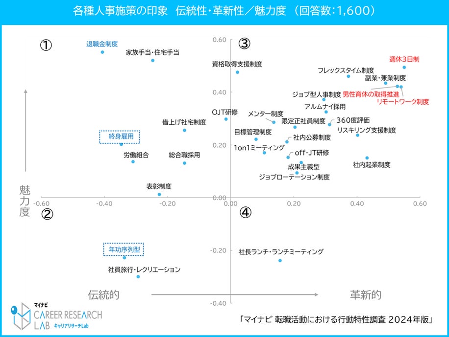 日本企業で取り入れられている人事施策・雇用施策30項目について、伝統性・革新性/魅力度の2つの指標におけるイメージを聞き、その結果を「①伝統的・高い魅力」「②伝統的・低い魅力」「③革新的・高い魅力」「④革新的・低い魅力」の4つにグループ分けした。
