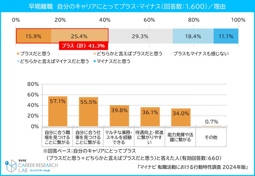 ◆早期離職を「自分のキャリアにとってプラス」と考える転職者は4割以上。理由は「自分に合う職場を見つけることに繋がる」が上位に