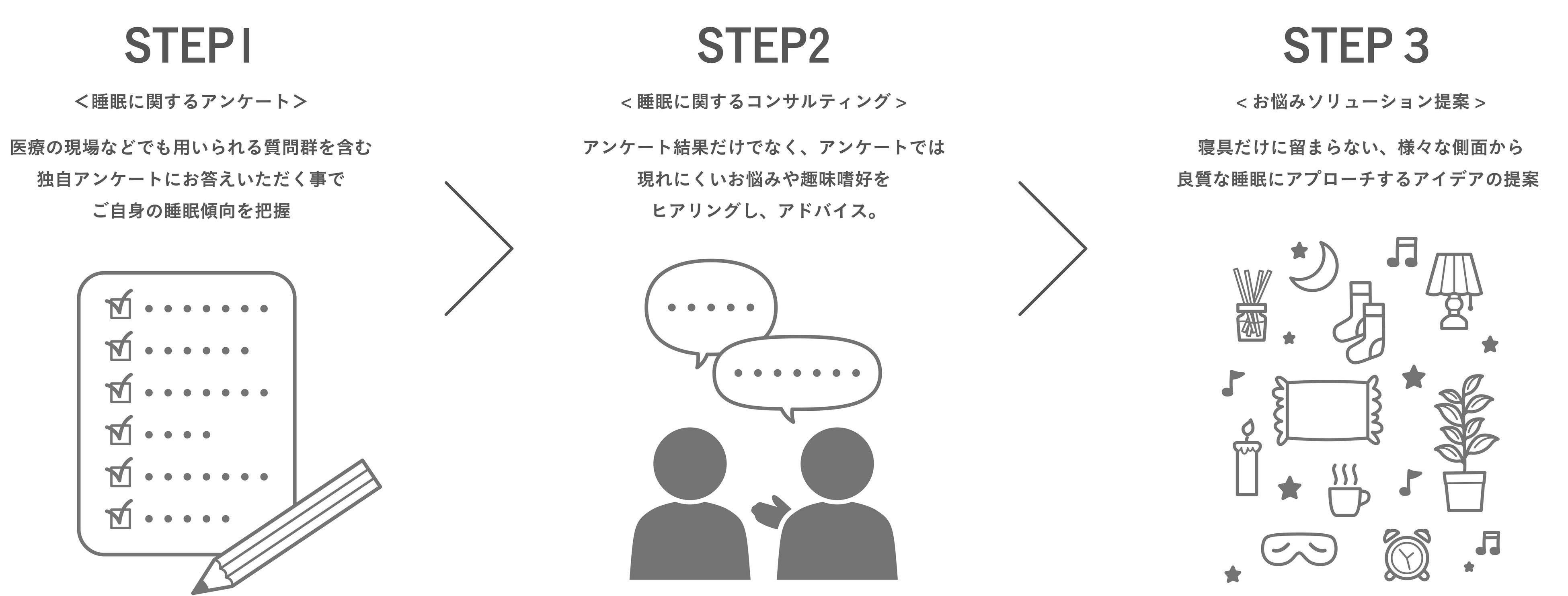 寝具はもちろん、インナーサポートアイテムやバスケアアイテム、リカバリーウェアなど睡眠時間の充実に繋がると考えられる多様な商品展開に加え、株式会社ブレインスリープの協力のもと、独自のアンケートによる「睡眠傾向の可視化」や、睡眠についての有識者による「コンサルティング」サービスを行います。