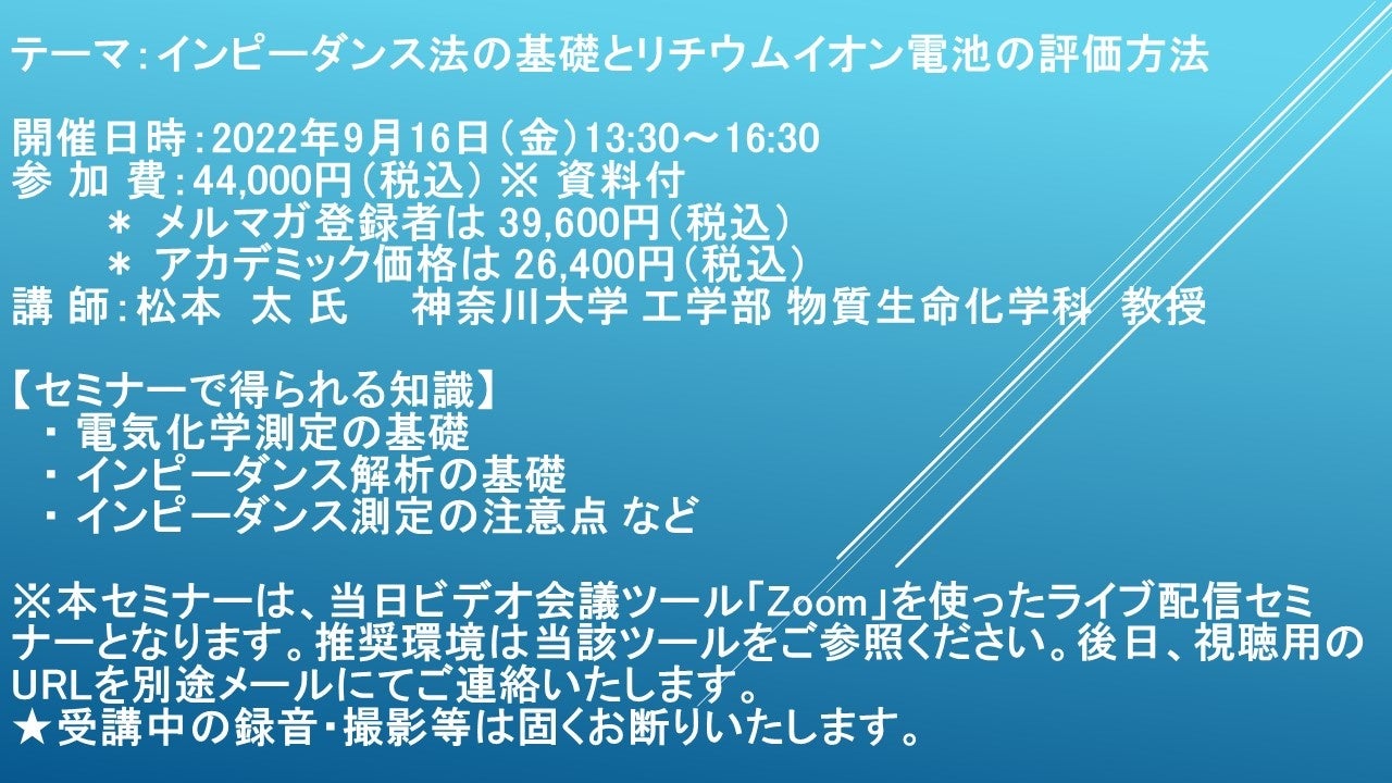 先端技術情報や市場情報を提供している(株)シーエムシー・リサーチ(千代田区神田錦町: https://cmcre.com/ )では、 各種材料・化学品などの市場動向・技術動向のセミナーや書籍発行を行っておりますが、 このたび「インピーダンス法の基礎とリチウムイオン電池の評価方法」と題するセミナーを、 講師に松本 太 氏 神奈川大学 工学部 物質生命化学科 教授)をお迎えし、2022年9月16日(金)13:30より、 ZOOMを利用したライブ配信で開催いたします。 受講料は、 一般:44,000円(税込)、 弊社メルマガ会員:39,600円(税込)、 アカデミック価格は26,400円(税込)となっております(資料付)。