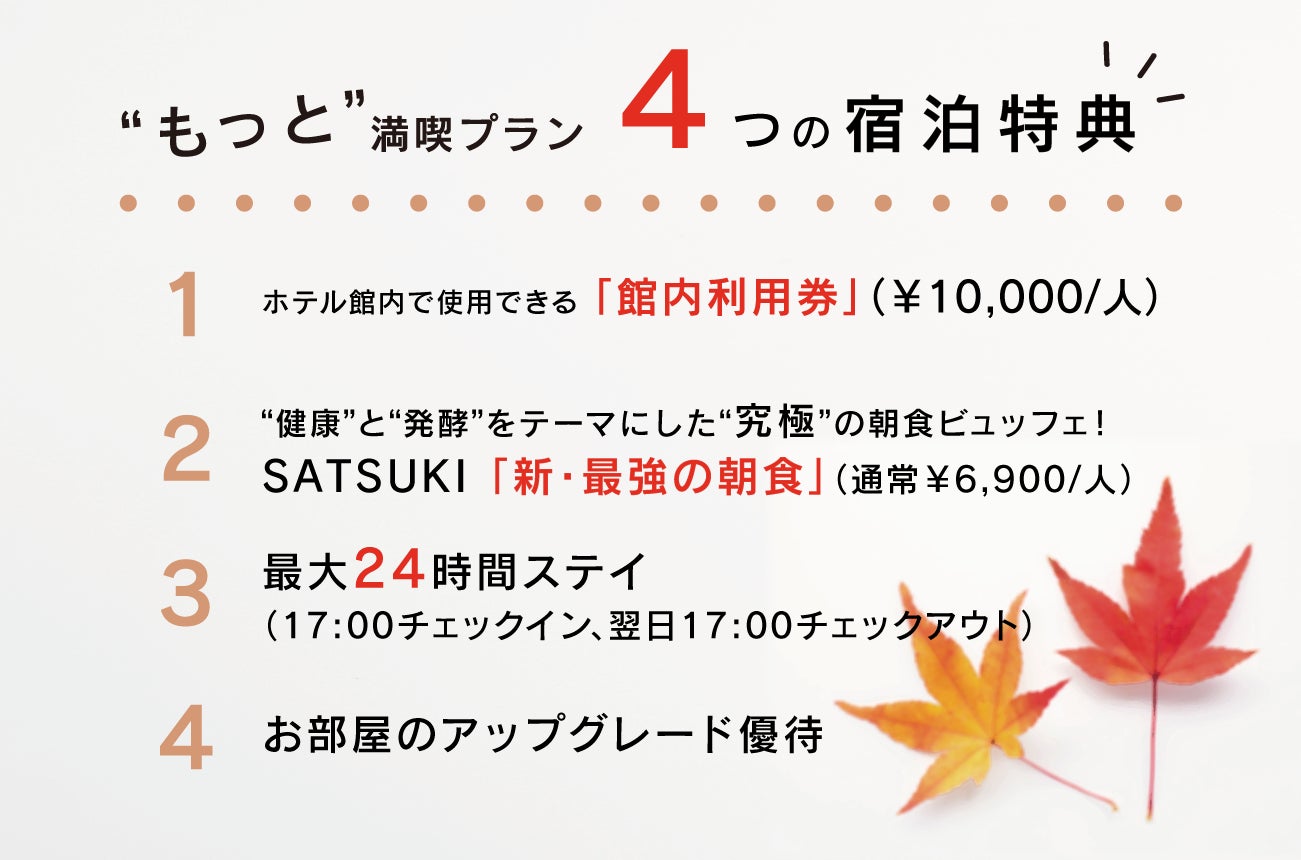 ホテルニューオータニ(東京)では、都民の都内旅行を補助する「もっとTokyo」(都民割)の実施期間を10月末まで延長することが発表されたことを受けて、ご滞在を最大限満喫いただけるよう、館内利用券やコーヒーショップ SATSUKIの「新・最強の朝食」など最大4つの特典が付いた『“もっと”満喫ステイ』を10月1日(土)~10月31日(月)の期間で販売いたします。