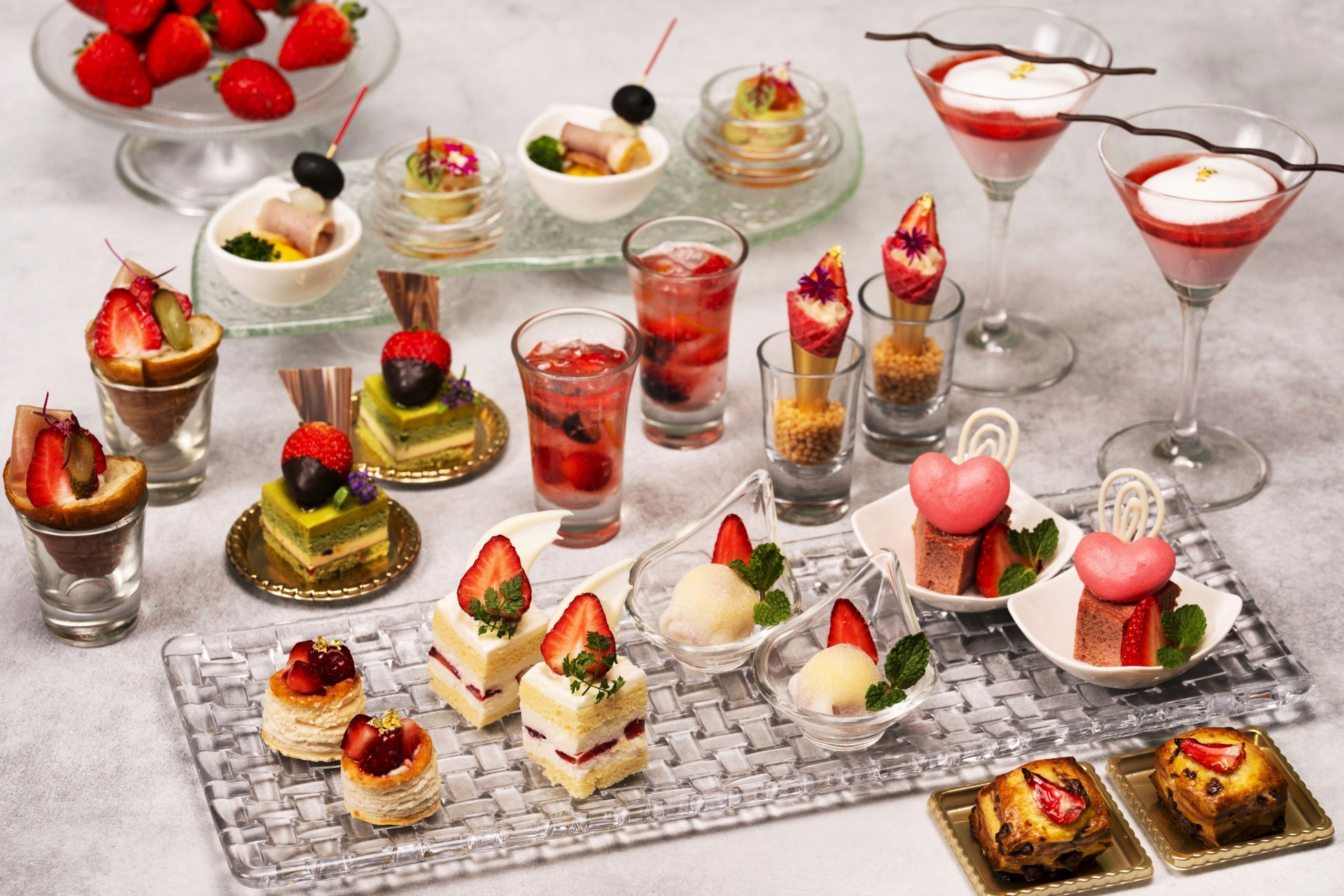 お母さまへの感謝を込めたメッセージ付きデザートプレートや、いちごのアペリティフ(ノンアルコール対応可)を用意しました。加えて、県産いちごなど、甘みや酸味の異なる 3 種のいちごの食べ比べも楽しめます。ティースタンドには、ストロベリーショートケーキやハート形のマカロンをあしらった苺のバウムクーヘン、まるごと1粒のいちごを包み込んだ苺のミニ大福など、いちごを使用した華やかで可愛らしいスイーツに加え、クロワッサンストロベリーの生ハムサンドや、鴨スモークとオリーブのピンチョスなどのセイボリーも並びます。