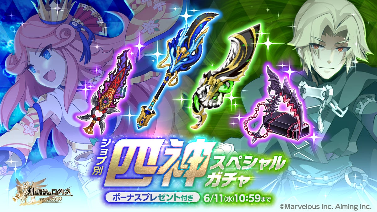 株式会社マーベラス(代表取締役社長:照井 慎一/所在地:東京都品川区)は、スマートフォン向け本格オンラインRPG『剣と魔法のログレス いにしえの女神』において、2025/6/1(日)に新武器がラインナップした「サポートジョブ別 現想女神確率アップガチャ」の販売、および2025/6/4(水)に「ジョブ別 四神スぺシャルガチャ」の販売を含むアップデートを行ったことをお知らせいたします。